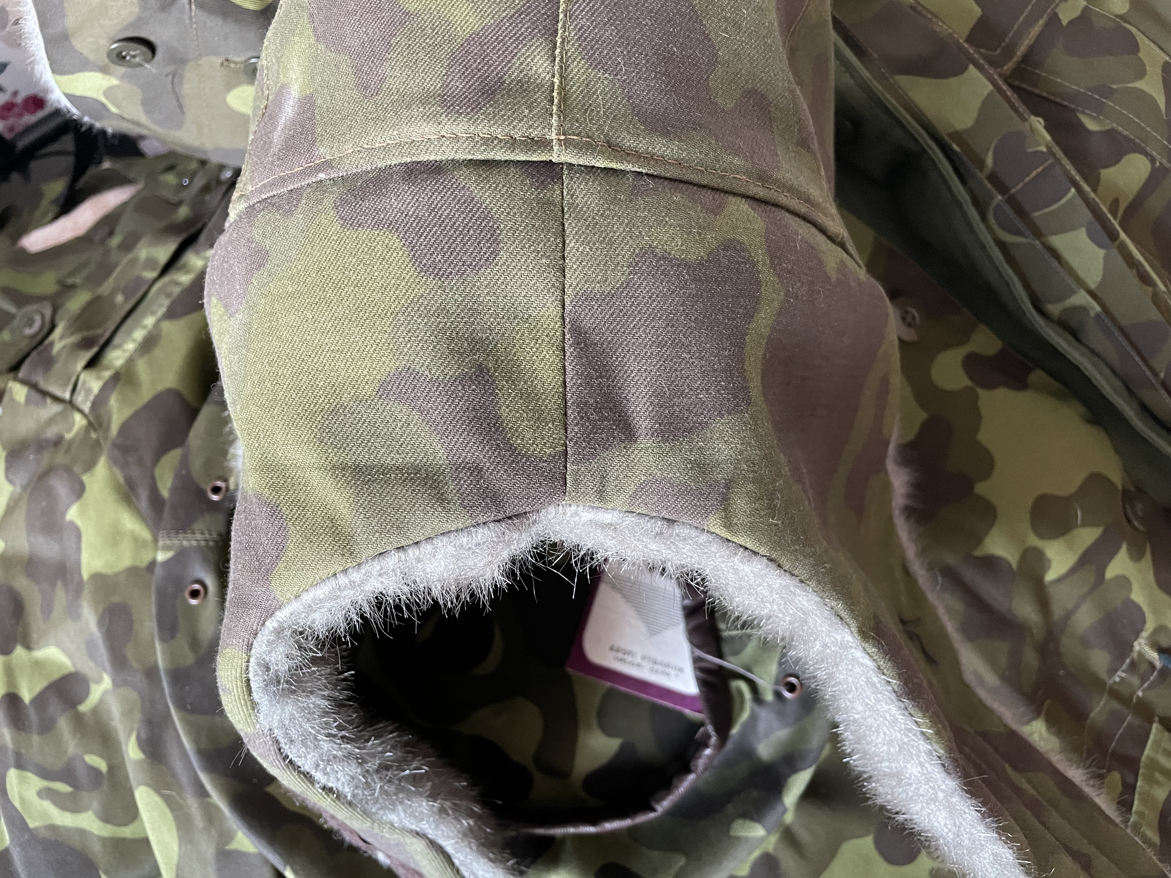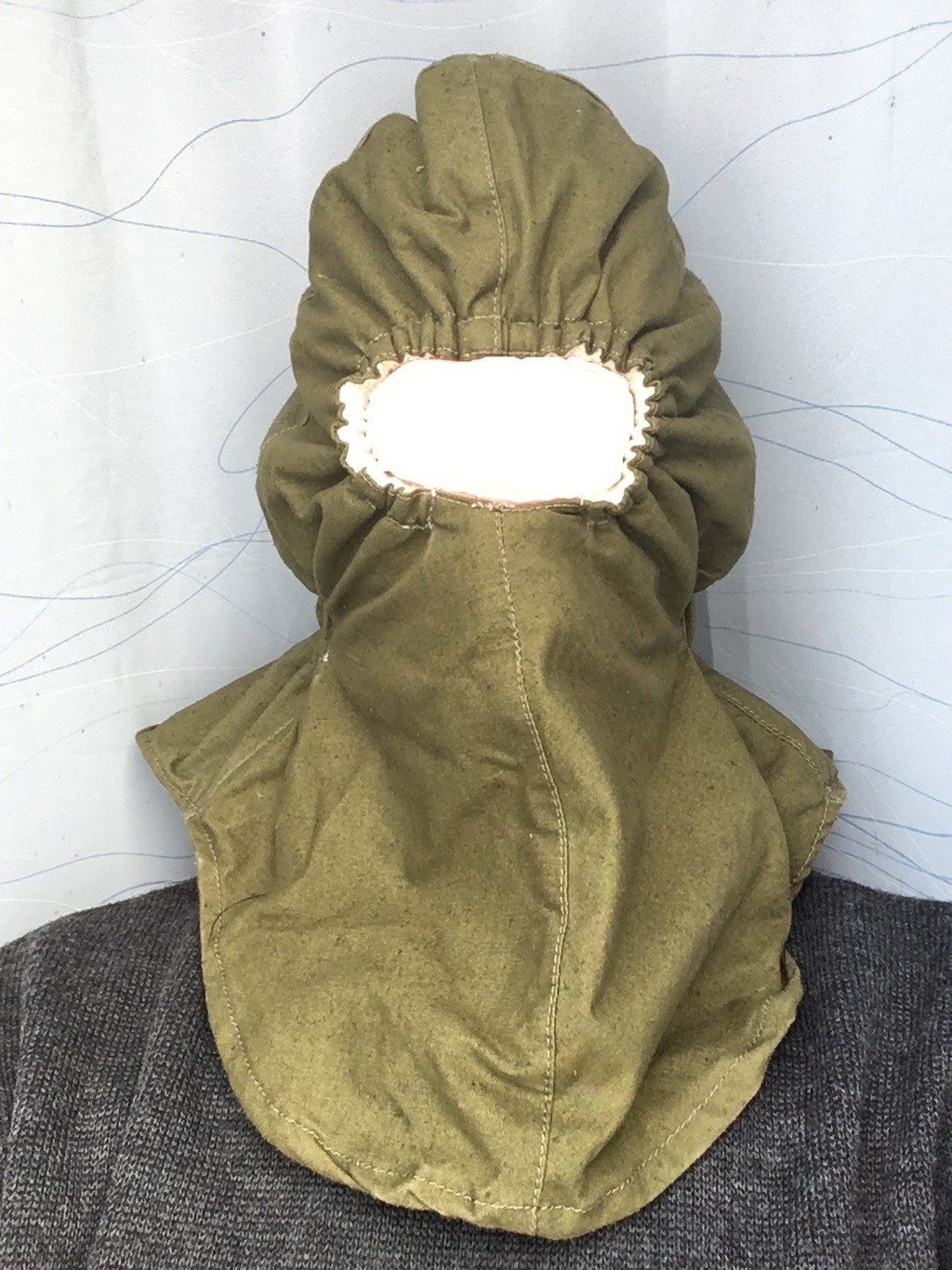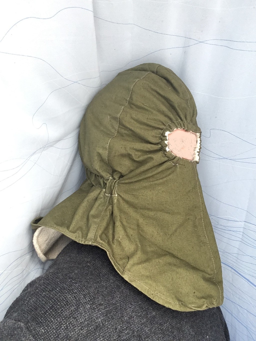 Venitasin veidi vastusega, et oleks mõtteainet. Kuperjanovi ÜJP (nimetan nii nagu toona oli), A-kompanii ehk luurekompanii teostas väljaõpet taanlaste juhendamisel ning põhirelvastuses olid VW Iltis maasturid. Otse loomulikult eemaldatud esiklaasi ja katusega, mistõttu oli talvel veidikene jahe sõita. Idee autorit ei tea, aga väeosa riidelao prouade poolt sellised külma ilma maskid valmis meisterdati. Välimine kiht üsna kore roheline riie, sisemine valge riie meenuta toonast käteräti materjali. Kätte need jagati, aga erilist armastust nende vastu ei mäleta, kui siis kandsid pigem autojuhid. Pärast autost jalastumist ilmselgelt liiga soe ja ebamugav kanda. Tootmisajaks julgen pakkuda 2001 november/detsember või siis 2002 algus, täpsemalt ei suuda meenutada. Kui ese läheb mitte-kapinurga-privaatkollektsiooni, siis mõttes olen selle kaasfoorumlasele BFMtudeng broneerinud.