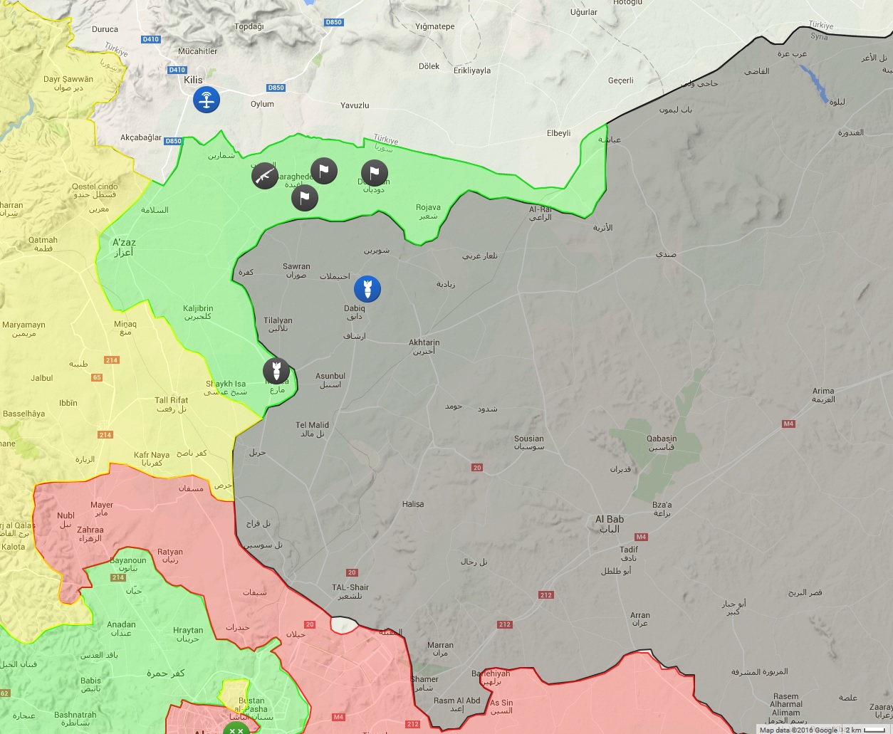 No ei suudeta ikka kuidagi seal Azazis minevikku unustada ja sõjakirvest kurdidega maha matta. Ma küll ei tea mis kana kurdidel ja azazi piirkonna sunni mässulistel omavahel kitkuda on aga täiesti ajuvaba, selle asemel, et üritada liitu moodustada ja mingit ühisrinnet isise vasut käib omavahel kohati suurem madistamine kui isise vastu. nüüd on siis tulemus käes, pea pool alast on isisele kaotatud. Kui SAA Azazi Aleppost ära lõikas oleks FSA meelsed jõud saanud kuulutada, et islamistide jõud nagu al nusra jäid aleppo ja idlibi poole ja kohalikud FSA rühmitused soovivad nüüd koos kurdidega suurt demokraatiat ja vabadust edendada. Oleksid SDF kattevarju alla liitunud ja saanud katise venelaste pommitamie eest ning üheskoos isise vastu asuda aga ei. Omavaheline sõdimine on ikka tähtsam.