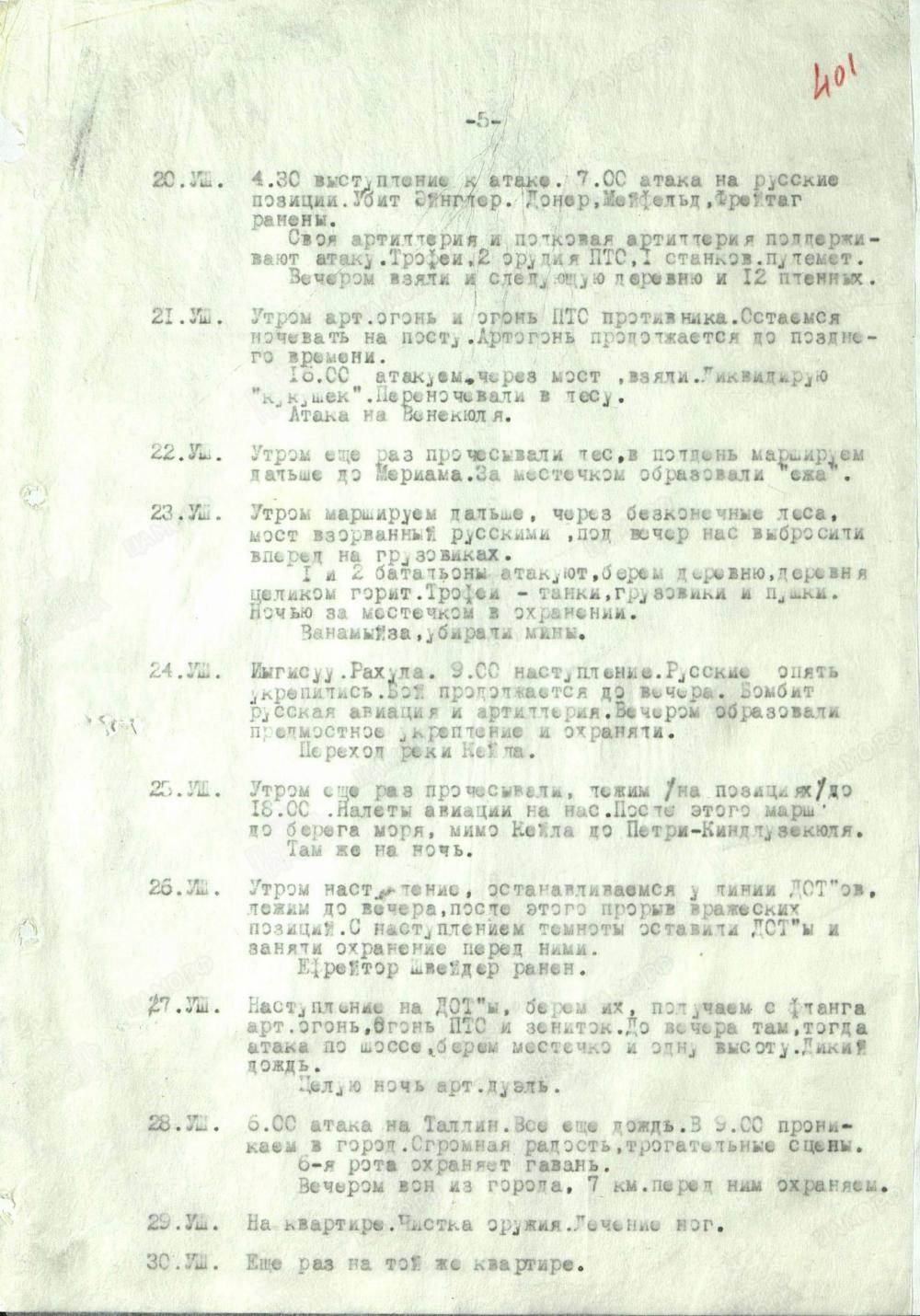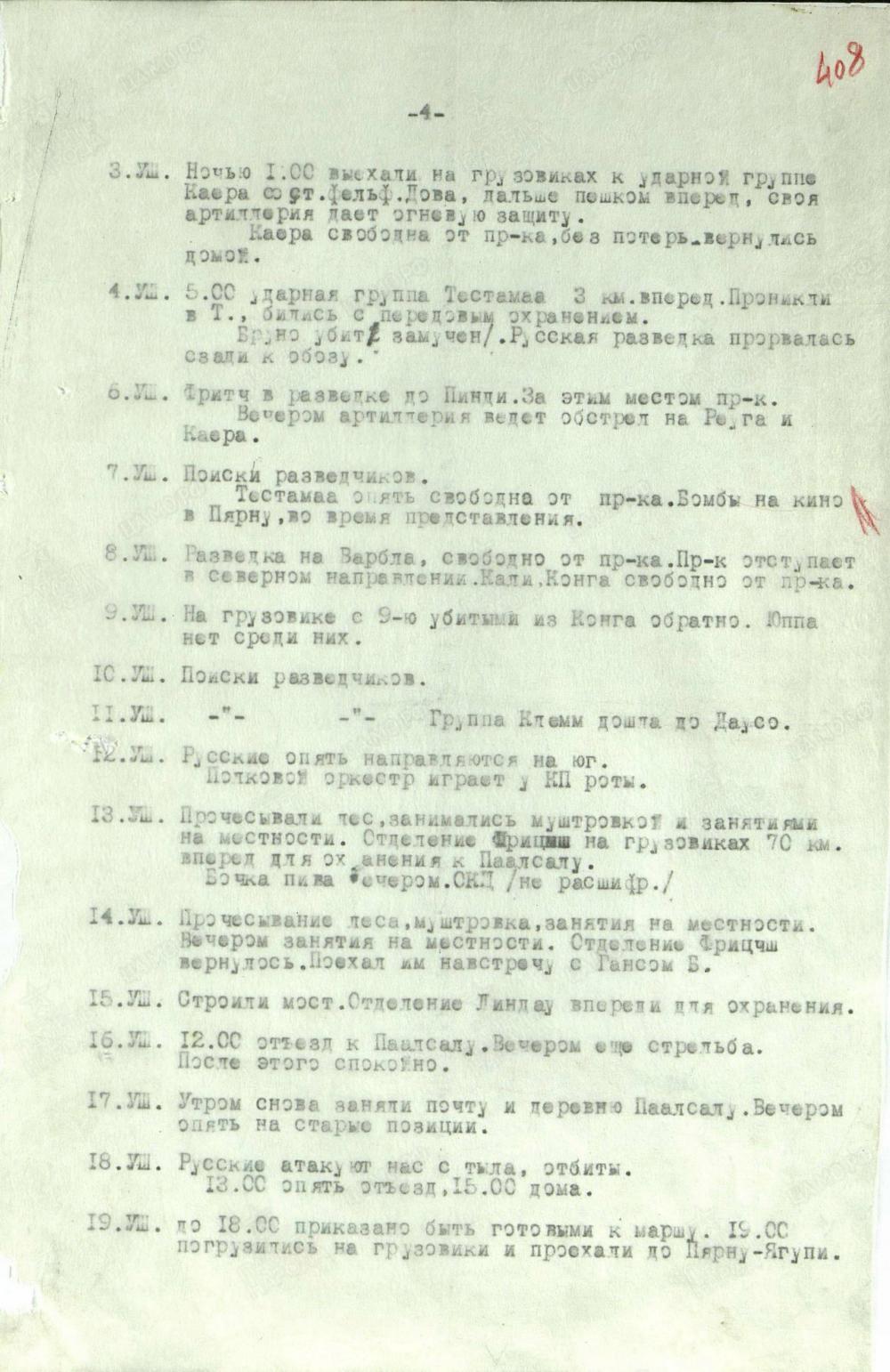 Gestern abend und heute Nacht mehrere starke Luftangriffe auf Pernau, 2 Abschüsse, ein weiterer wahrscheinlich. Etwa 135 Bomben, 22 Tote, 33 Verletzte, Fernsprechleitungen größtenteils zerstört.
