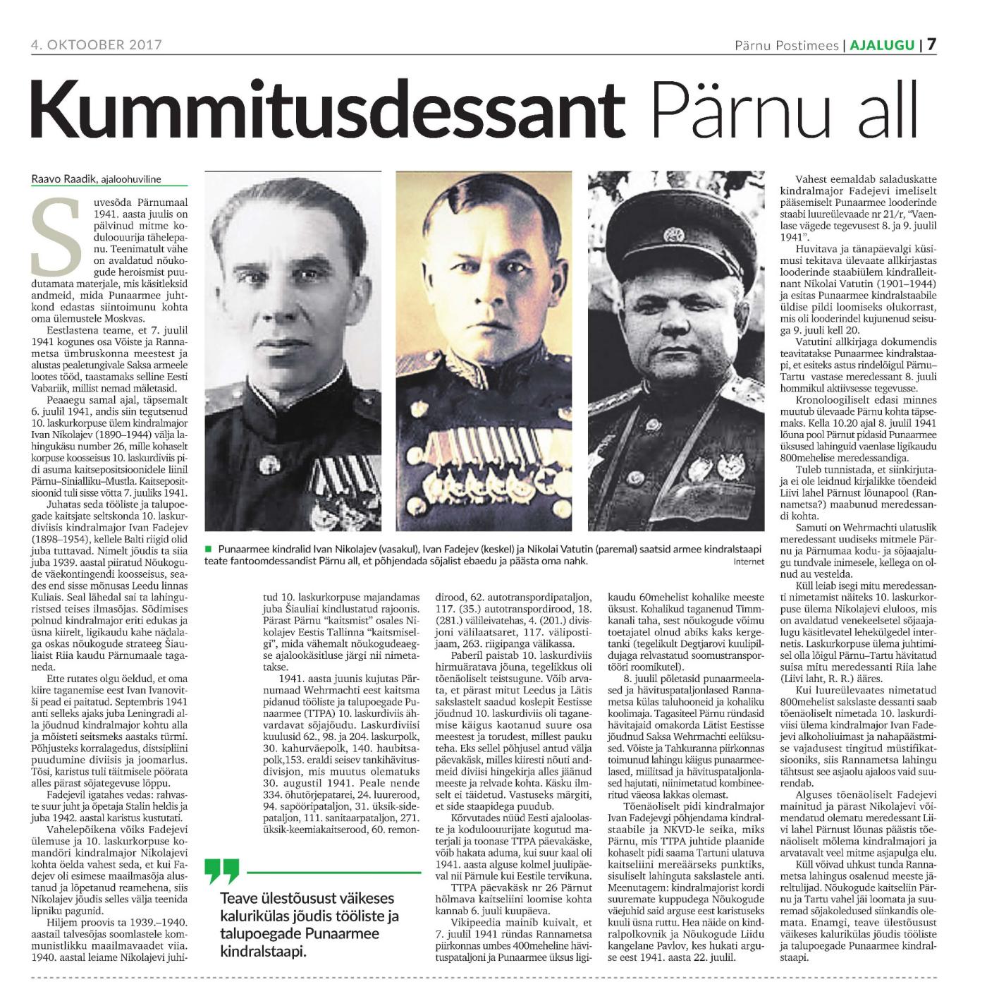 Arusaamatuks jääb, mis dessanti Raadik otsib? Tõenäoliselt peeti dessandiks Ullerspergeri eelsalka, mis punastele ootamatult Pärnu lähistele tekkis. Võib-olla keegi nägi veel mere peal ka mõnda laeva enam-vähem samal ajal ja oligi täielik segadus olemas.Umbes samasugune paanika oli juhtunud kohe sõja alguses ka Leedu rannikul, kus nähti mingeid laevu merel ja seepeale tõttasid olematut dessanti likvideerima PBL lennukid suurte jõududega.