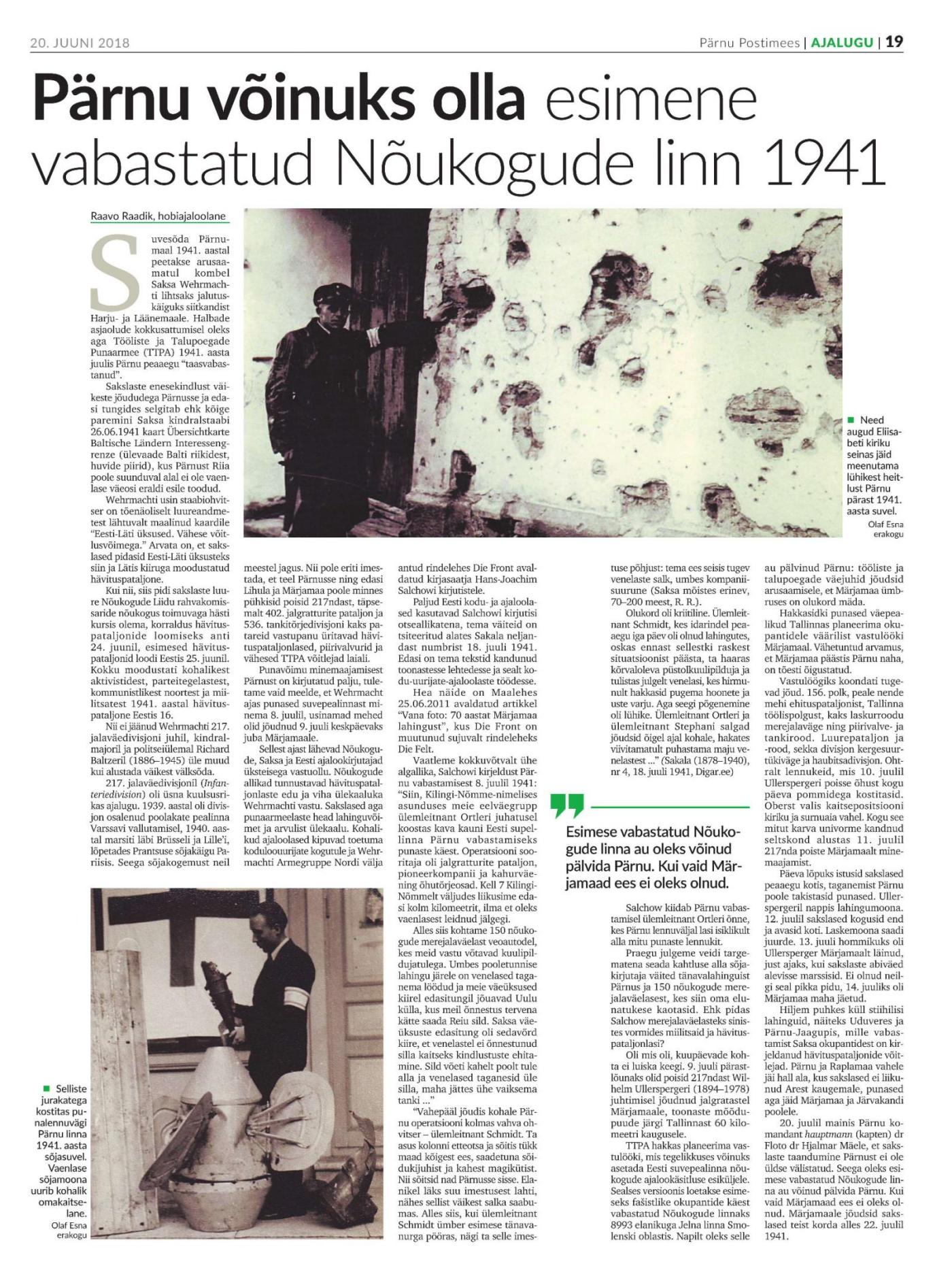 Igaks juhuks siia ka viited O. Esna artiklile Pärnu Postimehes ja tema artkli ühele allikale militeras:Da in Angelegenheit einer Verstärkung des Luftschutzes für die Stadt Pernau bisher gar nichts geschehen ist, erfolgte, wie vorauszusehen am 7.8.1941, 18,45 Uhr abends ein neuerlicher, sehr heftiger Luftangriff auf die Stadt Pernau. Aus 11 Flugzeugen wurden ca. 135 Bomben verschiedenen Kalibers, meist leichte Brizanzbomben, aber auch einige sehr schwere Bomben (ca. 250 kg) abgeworfen, von welchen, wie bisher festgestellt, 20 leichte nicht detonierten und derzeit als Blindgänger über die ganze Stadt verstreut liegen. Absperrmaßnahmen wurden getroffen. Es fielen auch einige Brandbomben, durch welche das Filmtheater und ein Magazin in Brand gesteckt wurden. In dem Kino fand gerade eine Filmvorstellung der P.K. statt, und es ist nur einem ganz glücklichen Zufall und dem raschen Eingreifen der 4 von der Ortskommandantur zum Ordnungsdienst dorthinkommandierten Feldgendarmen und der Disziplin der ca. 500 Besucher zu danken, dass keinerlei Verluste eintraten und die Entleerung des brennenden Kinos (aus dem noch die Filmapparatur gerettet werden konnte, das Haus mußte abbrennen), in Ruhe und Ordnung vor sich ging. Soweit bisher festgestellt, kostete dieser Angriff an Opfern: 10 Mann des R.A.D., 2 Mann der Marine, 1 Mann des Heeres, 1 Heereszahnarzt tot, außerdem wurden 15 Mann des R.A.D., 1 Heereszahnarzt und ca. 8 soldaten verletzt. Bei der Zivilbevölkerung sind 7 tote und 7 Verletzte. 5 Wehrmachtspferde wurden getötet, 1 Lkw, 1 Pkw zerstört, einige Lkws. stark beschädigt.
