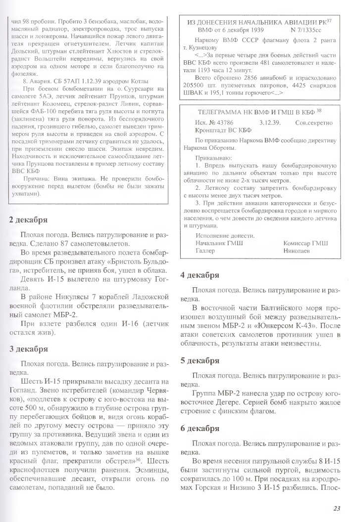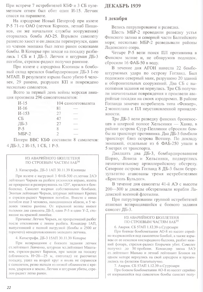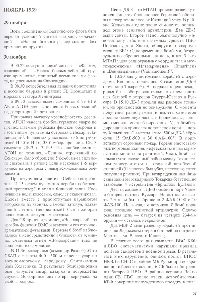 Igaks juhuks ka veel KBF lennuväe kroonikat sõja algusest Tirkeltaubi raamatust. Siit ei leia ka midagi rohkem kui juba eespool kirjas - esimese sõjapäeva 2 MBR-2 lendu on Laadoga järve alal, teise päeva 6 MBR-2 lend on ilma üksust ära toomata. Seega väide, et "10. SAB pommitas sõja esimesel päeval Soome sadamaid ja laevaliiklust" paistab praegu vale. On olemas ka väike võimalus, et 1. detsembri lennu tegid MBR-2 NLiidust (kui uskuda 9. dets. sündmusi kolm postitust tagasi, siis lennati ka NLiidust Soome lahe suule ja ei ole päris selge, kust Geust üksuse võttis - miks ta ei nimeta täpset eskadrilli vaid ainult brigaadi). Тиркельтауб Самуил Владимирович, Степаков Виктор Николаевич: Против Финляндии. Советская морская авиация на Балтике в войне 1939-1940 годов (võtsin suvalise faili internetist, ei hakanud enda raamatut pildistama)