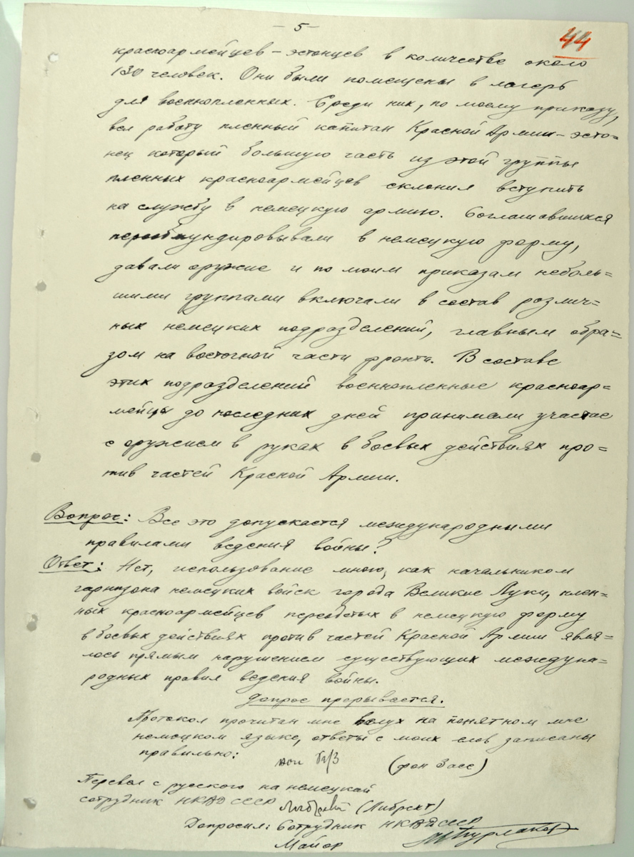 Протокол допроса военнопленного, бывшего начальника гарнизона г. Великие Луки подполковника фон Засса Эдуарда Георга с предъявлением ему обвинения в военных преступлениях