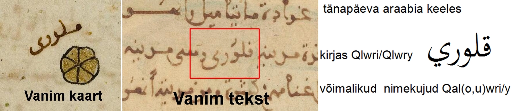Meri pakkus, et Qlwry on kogemata teise kohaga vahetusse läinud - võib ju täitsa nii olla. Samuti võib olla kirja pandud vigaselt. Siis võimegi jääda mõistatama, et mis see Qlwry õieti on. Maarika Mägi vist pakkus, et varem oli Tallinna linnuse nimi hoopis Härjapea (asus Toompeaga koos olnud Tõnismäel), hiljem säilis ainult jõe nimena. Ainult jõe nimena olekski imelik. Kõlab mulle väga loogiliselt, suuremad kõrgemal kohal olevad linnused olid -pead - Otepää, Tarvanpea. Tallinnas jäi hiljem kiriku järgi Toompea. Ka võis mäe profiil midagi meenutada, millest nimi saadi. Samas pidi Kalevan(linna) ka midagi olulist olema, kust need venelased muidu oma Kolõvani said, vaevalt et päris ise nimetasid selle. Mis reeglid ja variandid selle Qlwry väljalugemiseks araabia keeles õieti ongi koos väljajäetud tähtedega? Aga kui on vigaselt kirja pandud, siis jäämegi mõistatama.