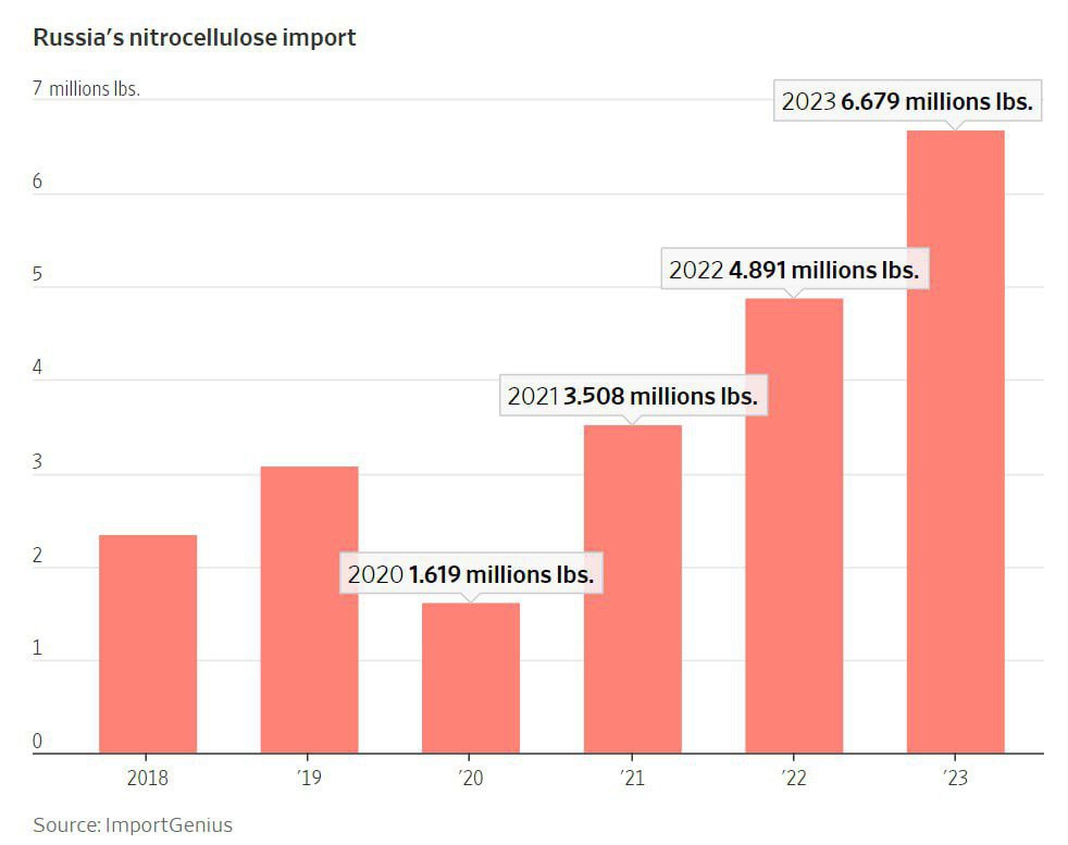 Venemaa on kaubandusandmete kohaselt suurendanud suurtükiväe laskemoona tootmiseks kriitilise tähtsusega lõhkeainesegu importi, sealhulgas USA ja teiste lääneriikide ning liitlaste ettevõtetelt, hoolimata rahvusvahelistest sanktsioonidest, mille eesmärk on Moskva sõjaaja tootmist lämmatada.