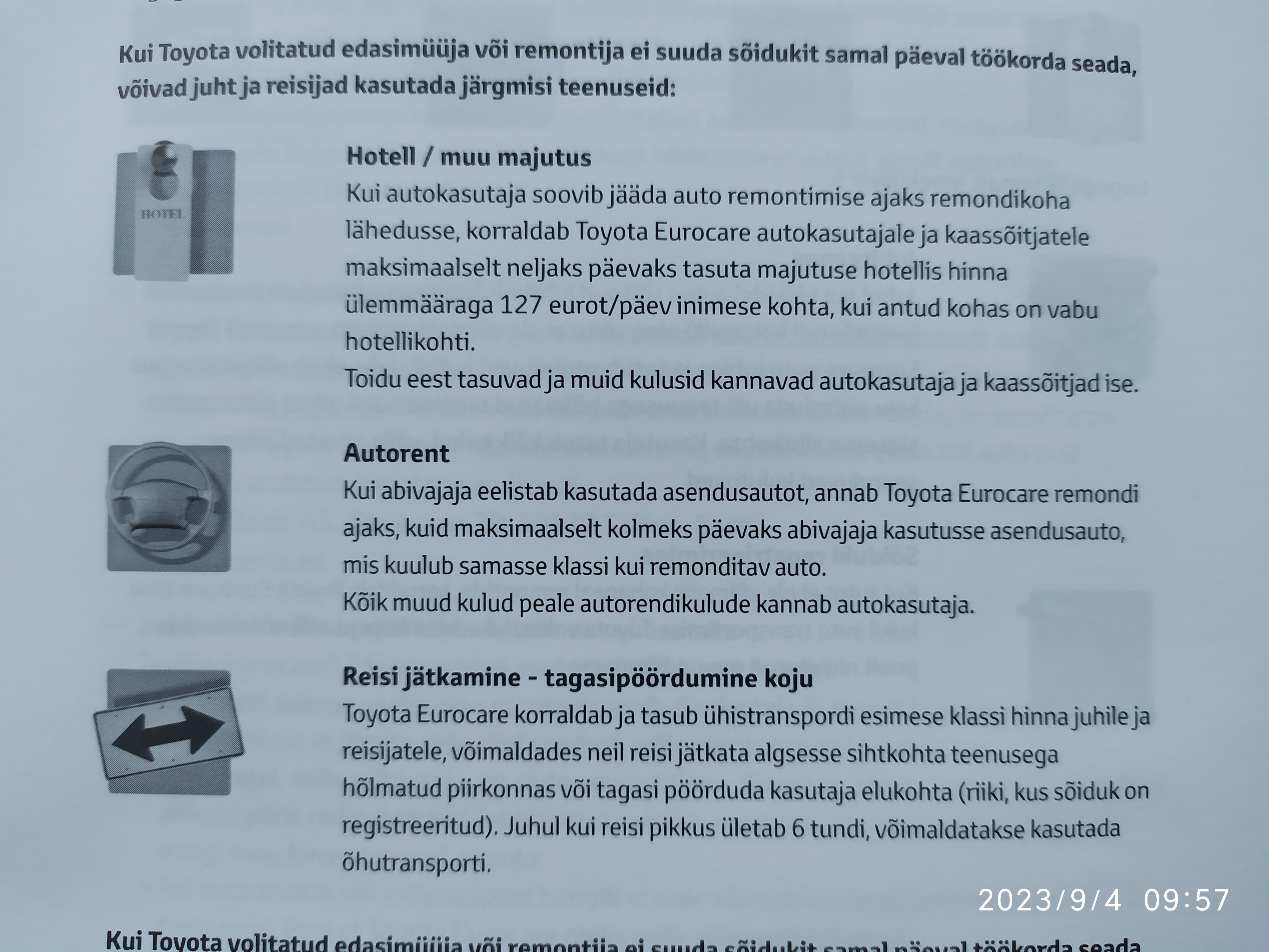 Olavi paneb siia väljavõtte oma 2022 Toyota juhendist, kus lubatakse küll asendusautot 3 (kolmeks) päevaks kui auto asub kaugemal kui 50km, aga see ei aita mind mitte kuidagi kui minu 1,5 aasta vanune masin on selle aja jooksul seisnud garantiiremondis ca 2 kuud varuosade ootel ja pean kasutama vana masinat. Ehk pole vana masinat mõtet müüa, kui ei oska ennustada uue masina töövõimet ja vanem masin peab kogu aeg varuks olema.AMvA kirjutas: ↑03 Sept, 2023 20:48Need on tegelikult kõigi autode garantiis, Olavi lihtsalt ei tea sedamaksipoiss kirjutas: ↑03 Sept, 2023 19:45Et sellised asjad garantiiga kaetud oleks ei pea ostma nn. premium klassi lux autot . on ka meil näiteks Hiluxit liisidesOLAVI kirjutas: ↑03 Sept, 2023 12:07 dada.