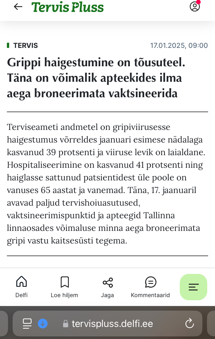 Eestis viiakse täna (17.01.2025) läbi ennetavat gripi vastast vaktsineerimiskampaaniat. Enamus apteegid jm raviasutused vaktsineerivad eelbroneeringuta.