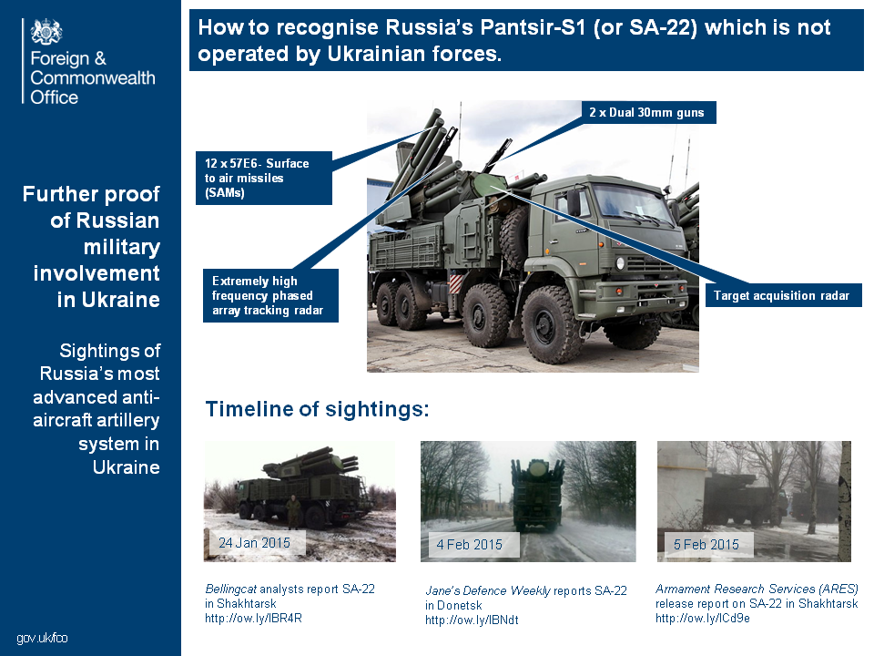 Lisaks sellele selgitatakse, kuidas sellist Vene relvasüsteemi, mida Ukraina armee relvastuses ei ole, tuvastada, ning esitatakse kronoloogia selle kohta, kus ja millal on seda Donbassis nähtud.