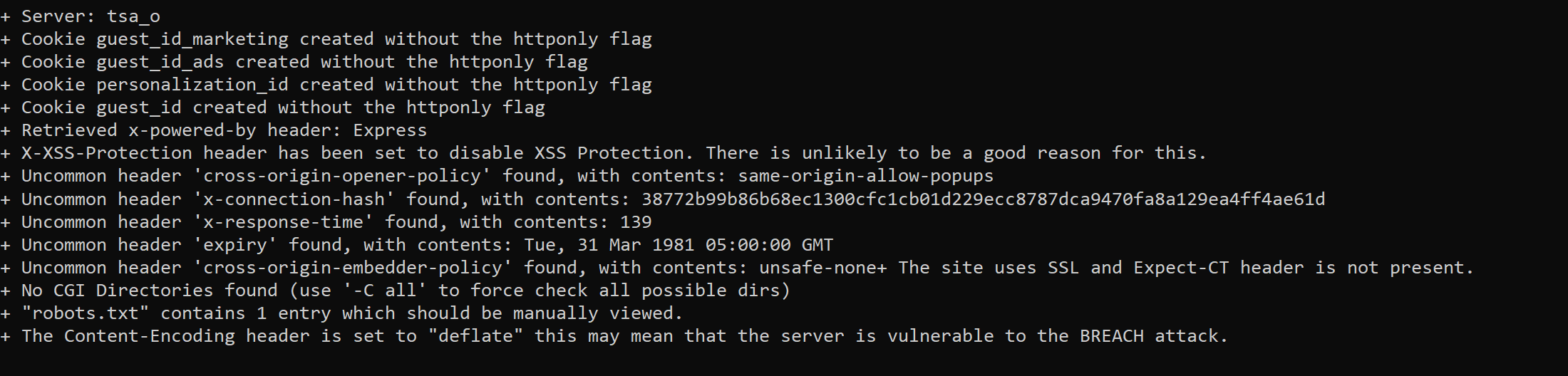 + /: The site uses TLS and the Strict-Transport-Security HTTP header is not defined. See: https://developer.mozilla.org/en-US/doc ... t-Security