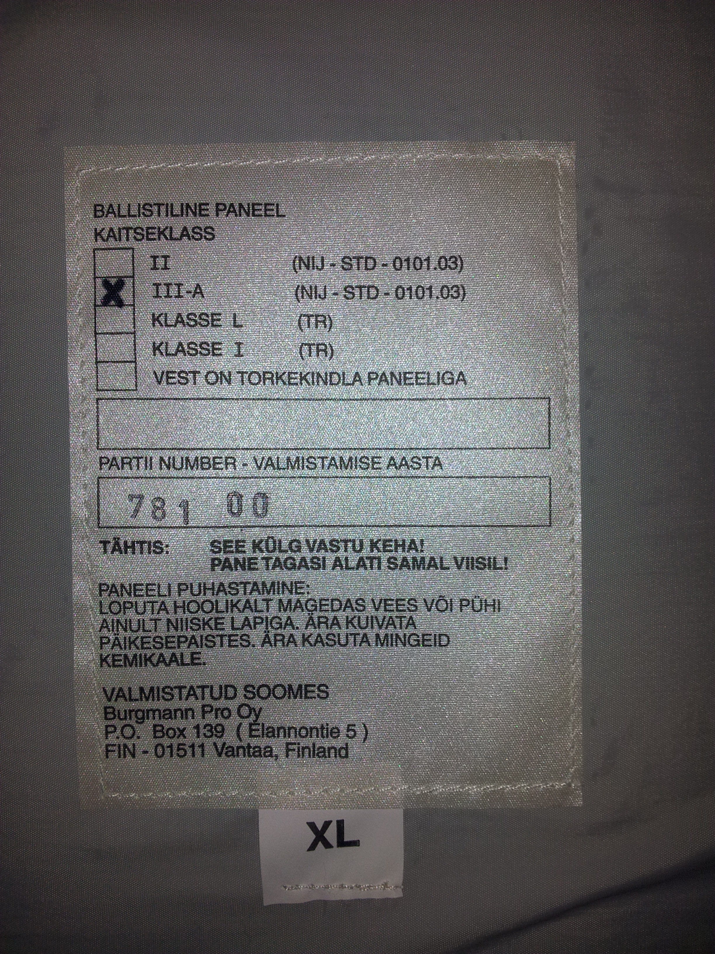 alban kirjutas:Tegemist on politsei kasutuses olnud vestiga. Täna kasutab selliseid üks KL Tallinna maleva allüksus. Päritolu on seega kas politseist või KL-ist pihta pandud. Väiksem tõenäosus on, et keegi on endale sellise tsiviilis ostnud aga selle vastu räägib tema sinine värv ja eestikeelsed kirjad plaadil.