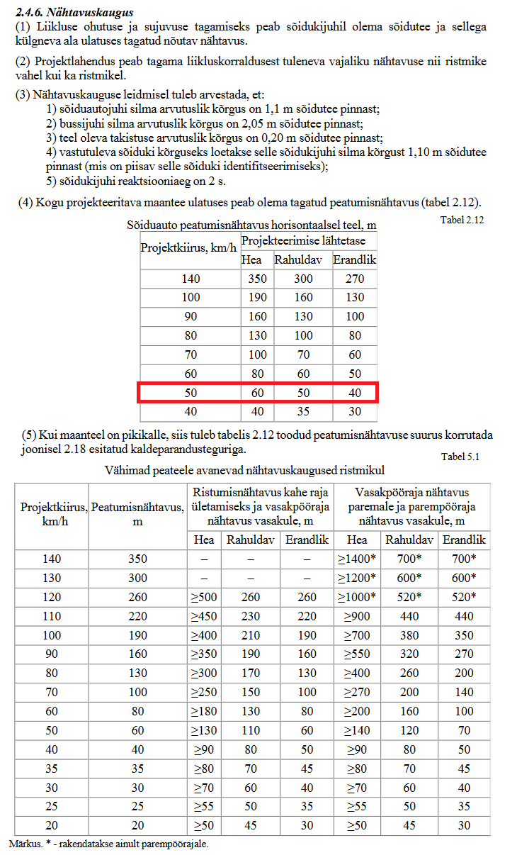 Siin http://www.militaar.net/phpBB2/viewtopi ... 65#p626165 ma tõin näite ühe sellise parkla kohta, mis rajati detailplaneeringu järgi ja mille kooskõlastas ära ka Maanteeamet. Seal on 50km/h ala ja nähtavuskaugus peaks olema (vastavalt kehtivatele "Tee projekteerimise normidele") kas 60m (hea); 50m (rahuldav) või 40m (erandlik). Ometi ehitati valmis ristmik koos parklaga selliselt, et enne hilisemat "vigade parandust" oli täispargitud parkla korral nähtavuskaugus 15-20m ja on pärast "vigade parandamist" ca 30-35m (mõõdetud aerofotolt, mitte vahetult kohapeal ristmikul)...