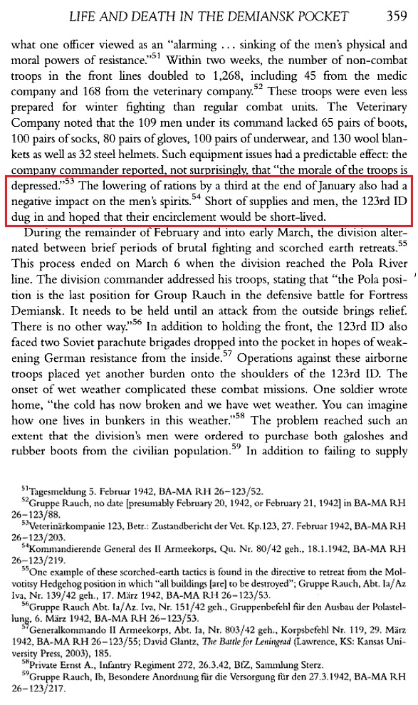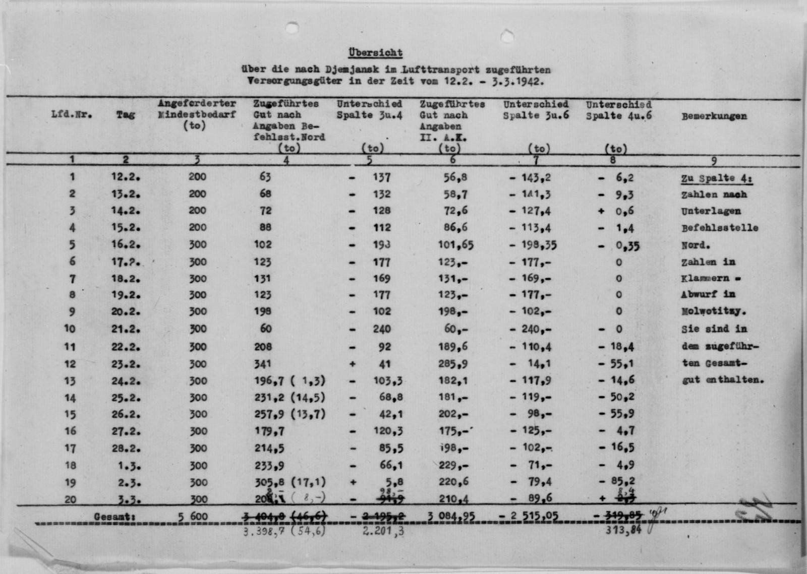 Luftwaffel võttis ligi 2 nädalat aega, et midagi hakkata kohale tassima veidigi arvestatavamas koguses (sealjuures ka seal tassiti kõigepealt muud kraami kui toitu). Märtsi alguses oli kusagil 70 töötavat JU52 üldse lennus. Samal ajal Demjanski kotis ei vähendatud isegi toidunorme (tuletan meelde, et Stalingradis tõmmati juba 4 päeval normid poolepeale). Kui poleks olnud varusid, oleks pidanud ka Demjanskis asi inimsöömiseni jõudma ... kuid ei jõudnud.