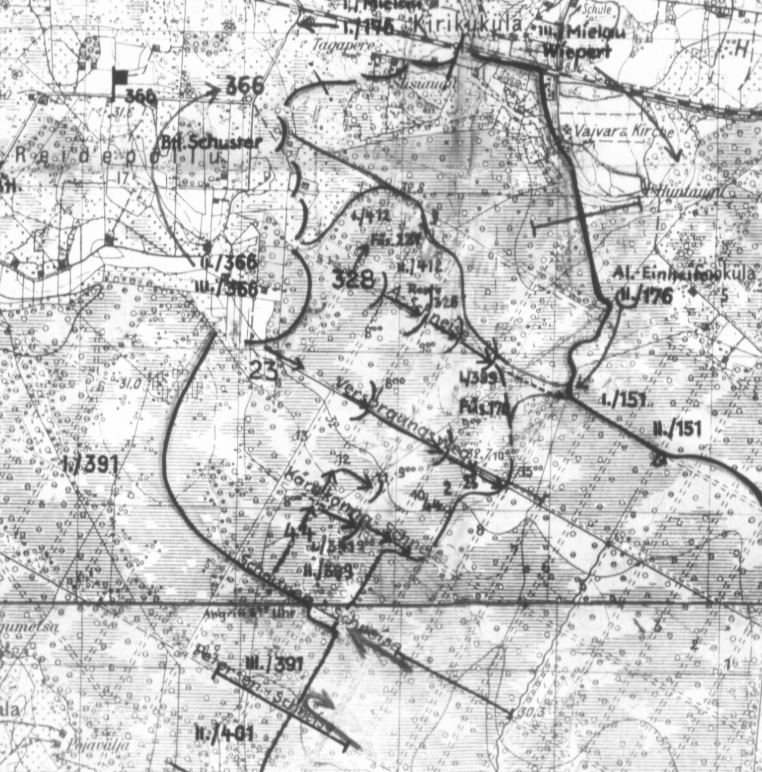 09,04 Rgt.23 hat Schneise 10 erreicht. Rgt.44 mit beiden Btln. beiderseits Kärekonna-Schneise nach O eingedreht, steht in Höhe Schneise 11.