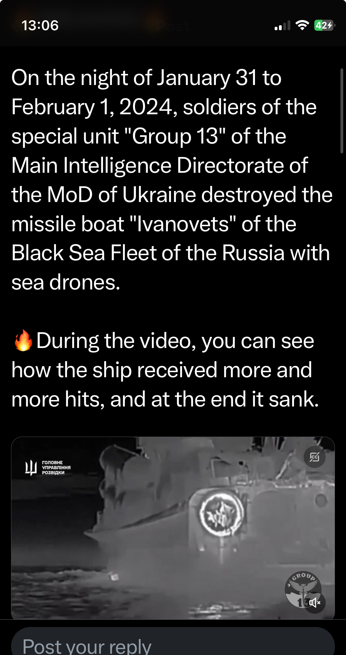 wk2 kirjutas: 01 Veebr, 2024 13:04 Ukraina mereväe kamikaze droon hävitas/vigastas 🇷🇺Vene raketipaati "Ivanovets". https://twitter.com/front_ukrainian/sta ... 3896579234