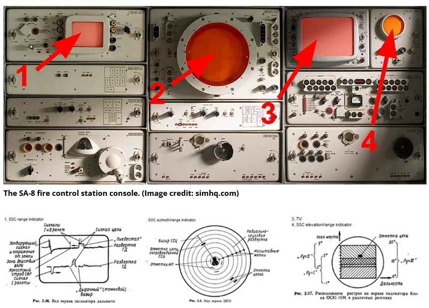 1 Ringvaatlusantenn vene keeeles: antenna SOTS. Toimib iseseisvana ja pöörleb töötamise ajal pidevalt 360 ringidena. Lülitub sisse sisupildil ümardisplei 2 plokis vasakus nurgas ülemise plommitava klapi all oleva nupu abil (indikaatorlambid kõrval kohe musta raamiga, sees-väljas). Teeb töötades ca 4 sekundiga ringi ja töötab kolmes kõrgussektoris- madal, keskmine, kõrge (ei viitsi praegu hakata kõrgusmeetreid otsima ega meelde tuletama). Automaatrežiimil vahetab ise iga ringi järel sektorit 1-2-3-1-2-3 jne. Seoses madalalt lendavate objektide ilmumisega on tehtud ka muudatusi järjekorras, rõhutamaks vajadust alt biitida tihedamalt, st üleühe siis: 1-2-1-3-1-2-1-3. Käsitisrežiimil valib operaator ise nupust sektori. (Nupud asetsevad samas ringdisplei plokis 2 ja on paremas servas, indikaatorid seal samas kõrval). Selle saatja-vastuvõtja sisselülitamisel kuvatakse ringdispelile 2 pidevalt ringiratast käiv joon, nagu sisupildi all oleval joonisel näha on (see parempoolne punktidega joon). Kui ilmub kriipsuke, siis see on detekteeritud objekt. Häirete korral, (st nagu tavaliselt) on see displei igatsugu manti ja sodi ja peegeldusi täis, filtreeritakse puhtaks nuppudega sealsamas stoikas operaatori töökohal. Ringdisplei kõrval plokis on ka "oma-võõras" päringunupud. Kui objekt vastab talle edastatud spetsiifilise päringupingimise peale koodiga, mille ZRK "oma-võõras"-moodul tunnistab omaks, siis kuvatakse operaatorile vastav märge displeile faktiliselt samaaegselt leitud objekti märgiga. Sellel keskmise stoika all oleval joonisel on meie näitel hetkel tuvastatud kaks sihtmärki: paremal all oma (näha peegeldus), ja vasakul üleval võõras, selle peale on juba keeratud ka APU, aga seda vaatleme hiljem teisi antenne käsitledes.