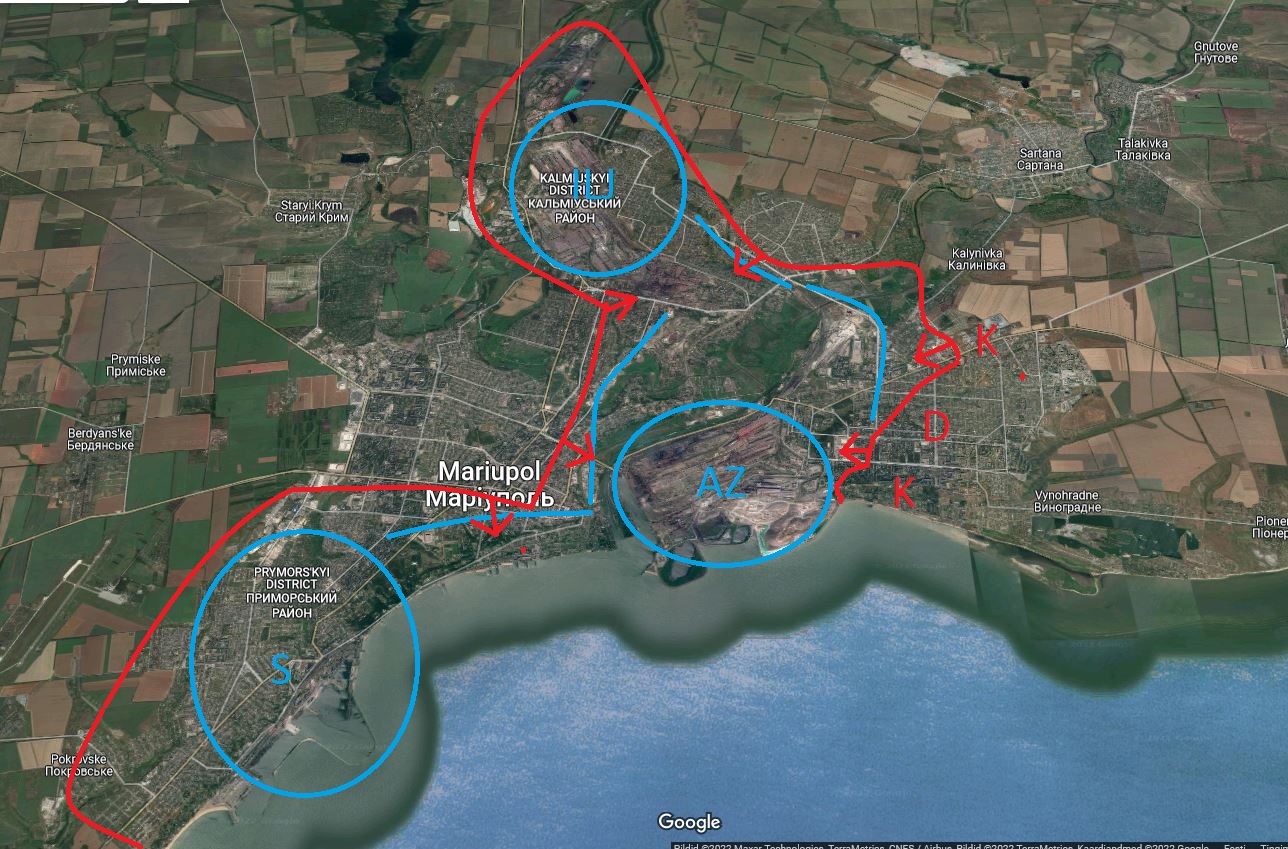 Olgu siis kõigepealt tuhk pähe. Mariupoli kaitse peab, ja paistab, et hetkel – kaks nädalat hiljem minu pessimistlikust prognoosist – ei ole see isegi veel eraldi vastupanukolleteks lõhutud. Häbi mulle! Panen siia väga skemaatilise kaardi.