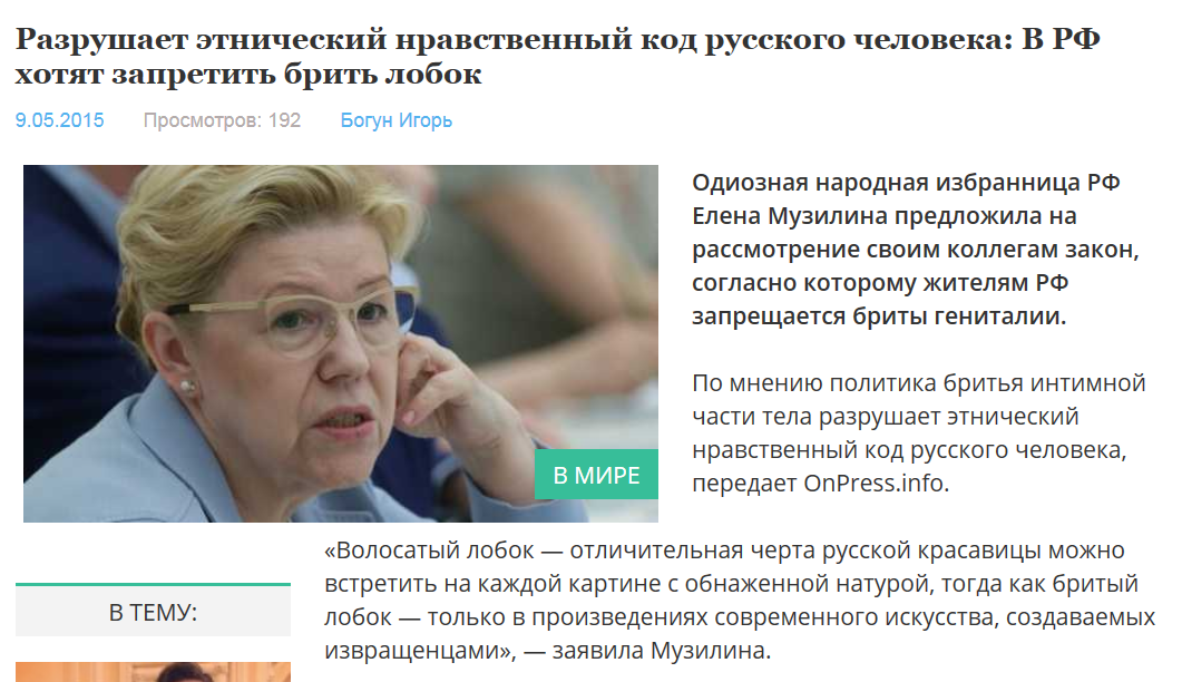 - Meie naiste korratud seksuaalsuhted on võtnud mastaabid, mis ohustavad Venemaa suveräänsust. Kaalul ei ole pelgalt deržaava au ja väärikus, vaid, ennekõike, kaitsevõime. Kui kõik need litsid heidavad nii kergesti välimaalaste alla, mida siis võib neilt oodata, kui NATO tungib Venemaale? Будем воевать пелотками? (ei oska seda tõlkida ja vene-eesti sünaraamatut ka ei leia) - mõistatas Jelena Mizulina