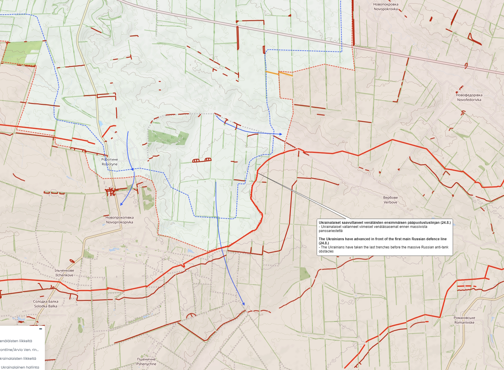 The first significant fortified obstacle is located just outside Robotyne. The Russians have prepared formidable defences, which include covered firing positions and bunkers. From here, the Russians can defend against attacks from both north and east.