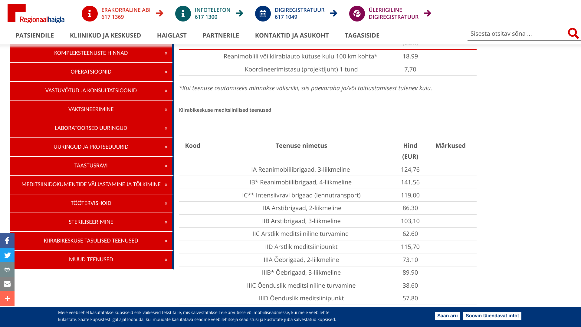 Hetkel kehtiv Kiirabi tasuliste teenuste hinnakiri: