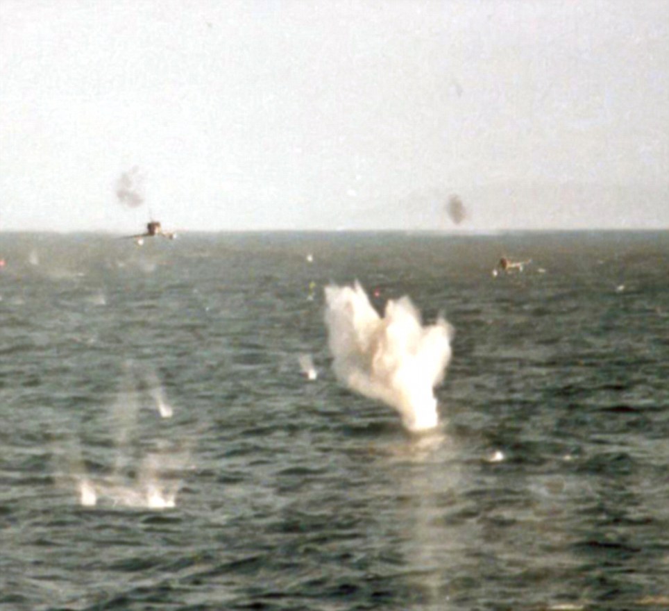 ...kes ründavad Argentiina Iseseisvuse päeval, 1982 aasta 25 mail oma A-4B Skyhawks lennukitega brittide laeva HMS Broadsword. Piloodid jäid mõlemad ellu, sest väidetavalt ei suutnud laeval asuv sea Wolfe raketisüsteem lühikese reageerimisaja tõttu lennukite vahel valikut teha. pilt on tehtud rünnatava HMS Broadswordi pardalt.
