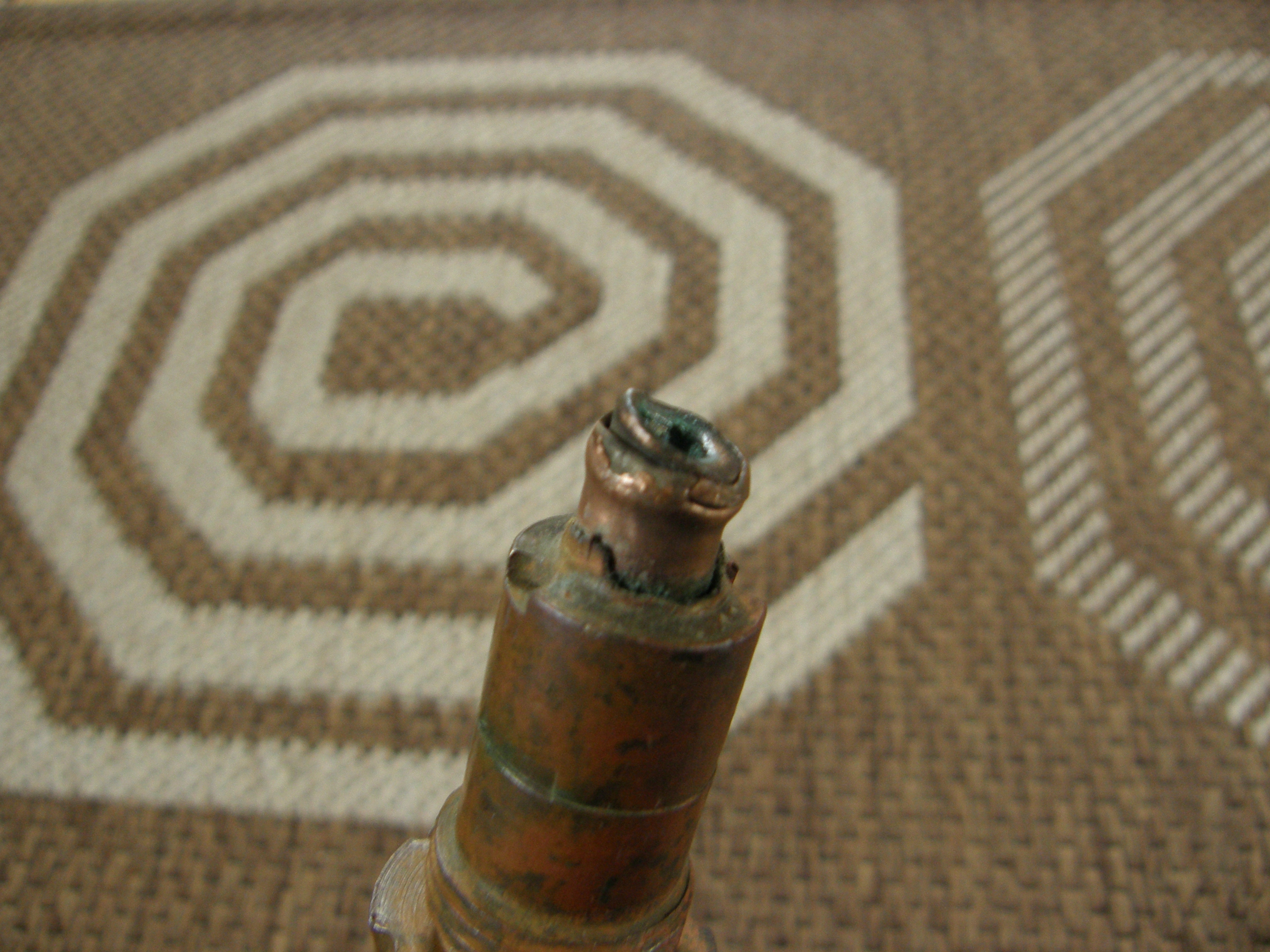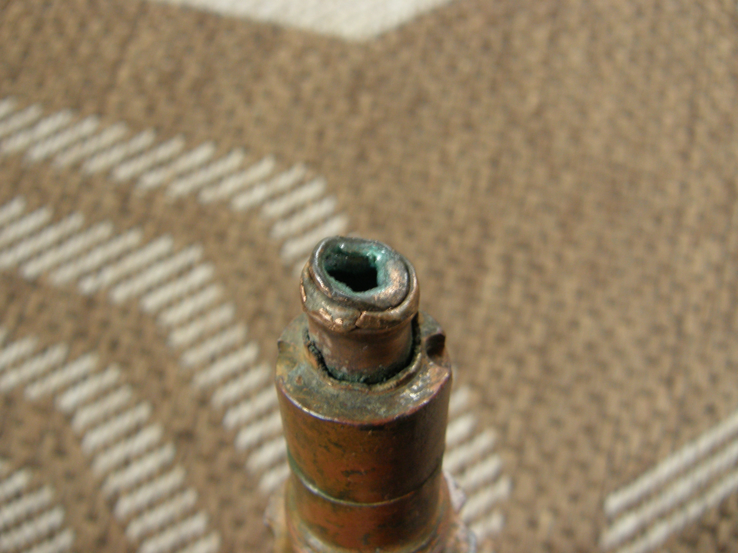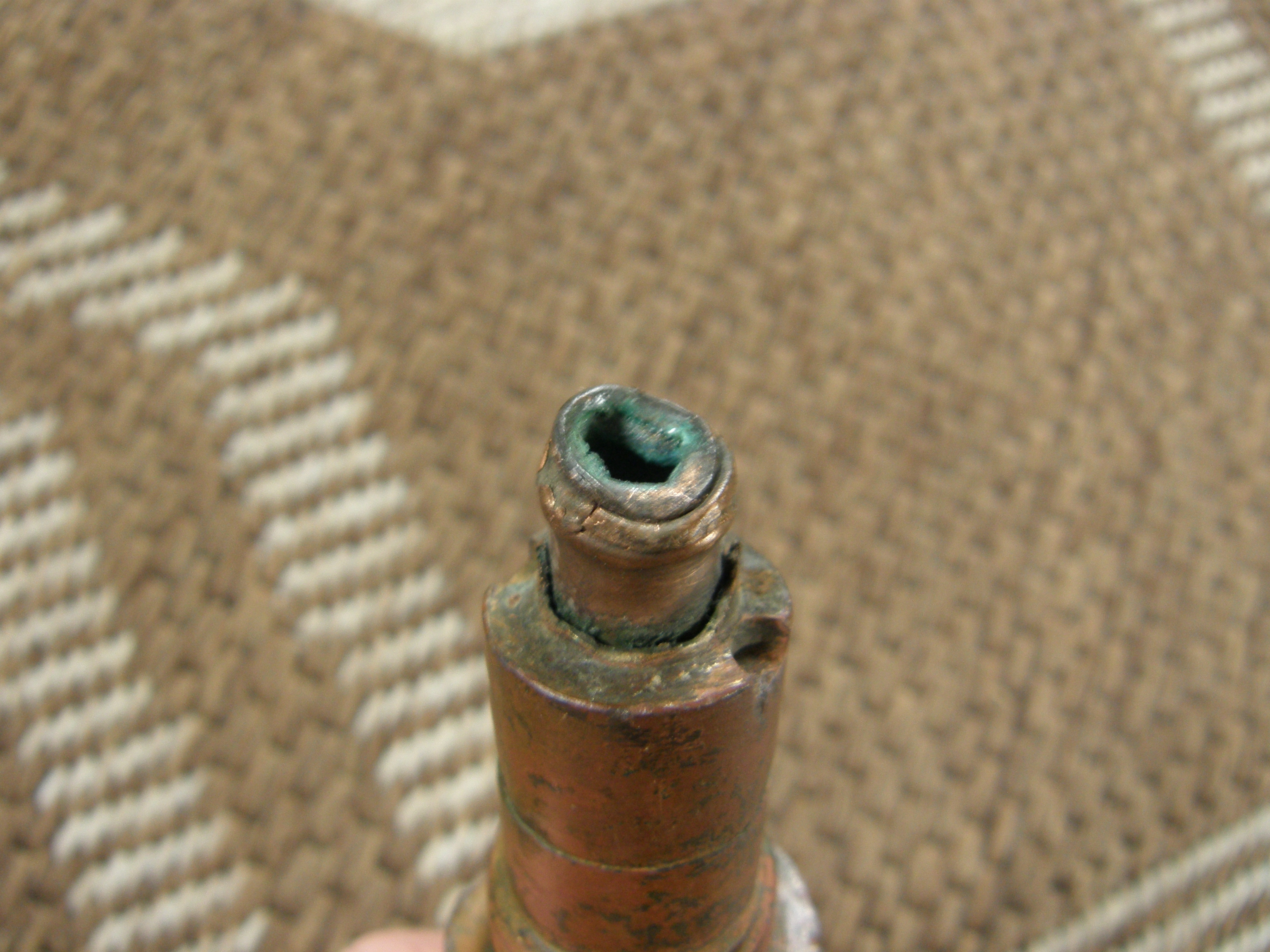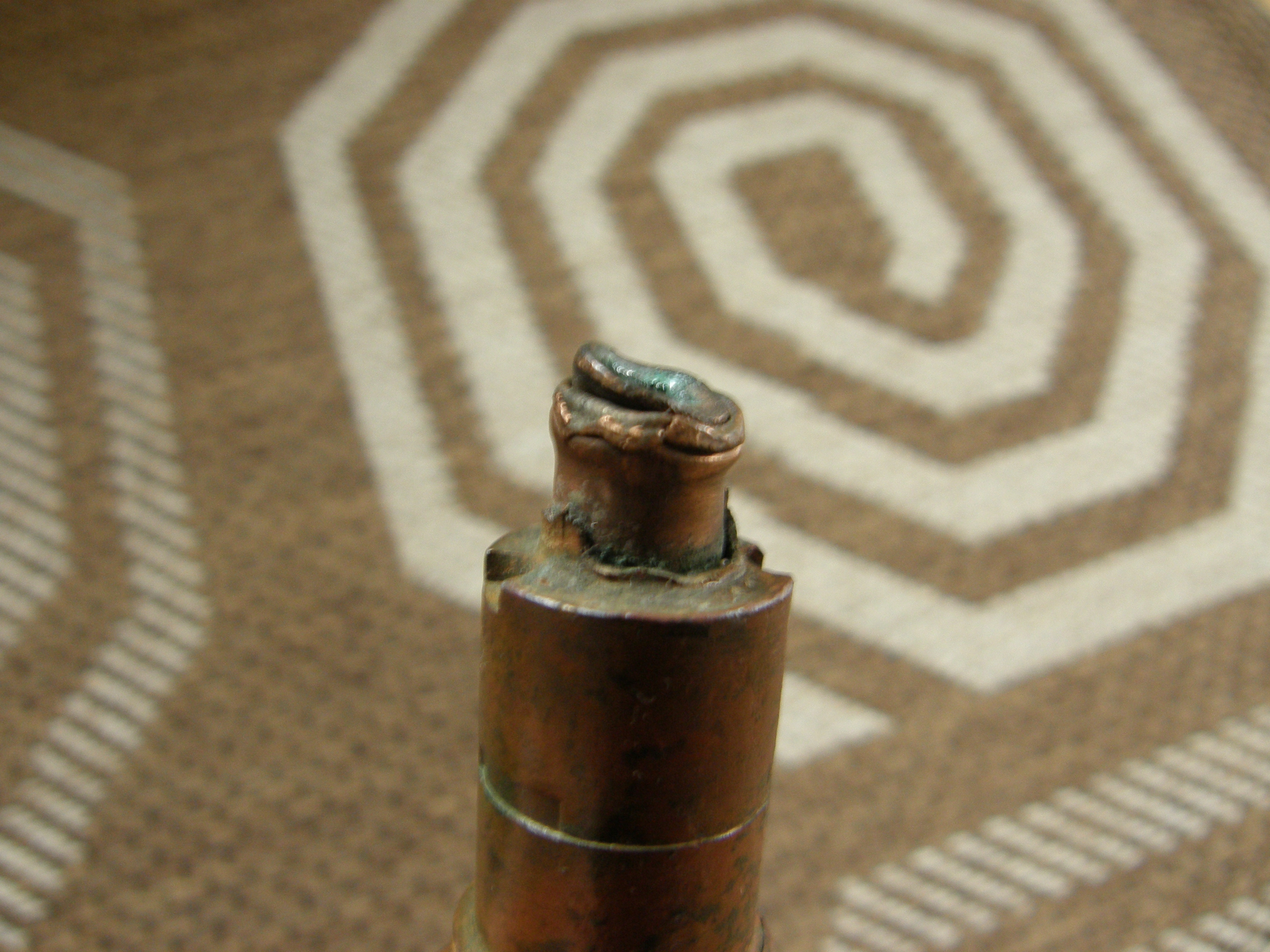 Noh, kui disainiks ostad ainult selgelt ohutuid palvankasid või kiivreid, kaste või muud sellist, siis ei näe põhjust, miks see peaks vähem rahulikum olema kui näiteks markide kogumine. Aga jah, ikka ostad mida tead, aga see sütik oli küll ilma täpse teadmiseta soetatud, kuna oli kirjas, et ohutu ning nägi huvitav välja. Aga arvan ise ka, et ta on täiesti ohutu, asi nüüd käes ka. Loodan samuti, et see asi selgelt mingit ohtu mitte kujutavana siis kedagi ka ei häiri. Panen veel mõned täpsemad pildid alumisest otsast, sealt on näha, et ots kus detonaator kinnitub on deformeerunud plahvatusest ning põhjas ka plekk deformeerunud, mis sisemisse kanalisse tee avab. Seega sealt see tuli pidi sees käima ja ka selle tongi läbi lööma. Küljelt on ka väikese matsu saanud, vask on muljutud.