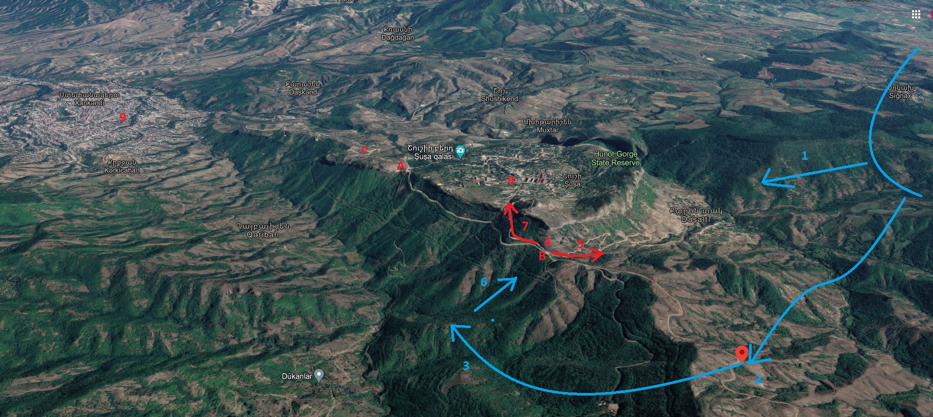 A - video 04.11. jõuavad oma sõiduga siia. Samal päeval muutub Dasalti (Karintaki) küla eesliiniks, sest aserid on kõrvaloleva mäe nõlvadel (1) . Kelle käes küla ei ole selge. Tõenäoliselt on armeenide kaitse sees. Samal päeval jõuab vähemalt üks aserite diversioonigrupp Latšini Susha maantee (2 - siin varem läbinud video) ja laksub üle hatja järgmisesse orgu (3) . Seetõttu on edasi sõitmine ohtlik. Kuigi aserite grupp jääb droonide koordineeritud tule alla, siis ei pruugi neil tingimata kaotusi olla, ainult üks mürks tabab suht lähedale. Küll oleks näidatud, kui oleks olnud rohkem näidata. Spekuleeritakse, et tegemist VF Orlan10 drooniga, mis nüüd armeenidele tarnitud.