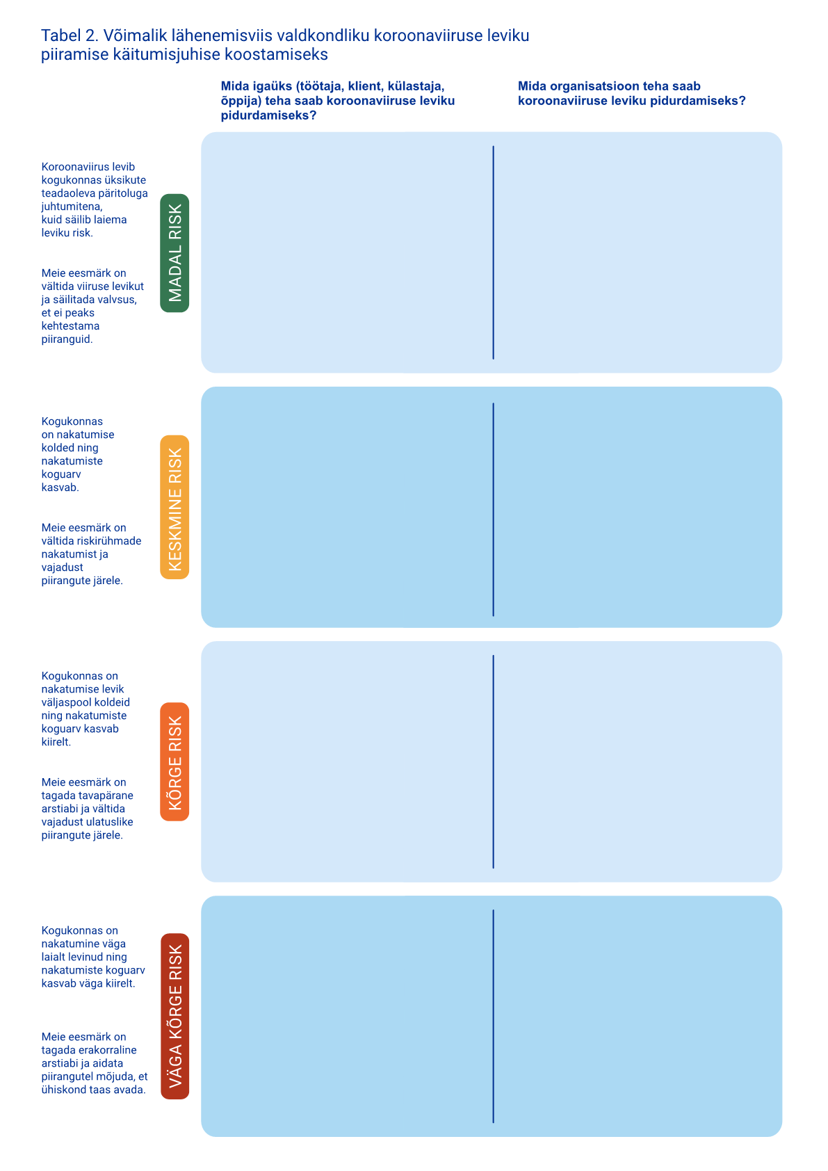 Hetkeolukorra hindamiseks võetakse kasutusele neljaastmeline riskitasemete süsteem. Rohelise, kollase, oranži ja punase värviga tähistatakse vastavalt madalat, keskmist, kõrget ja väga kõrget riskitaset, mille puhul kirjeldatakse indiviidi- ja organisatsioonitaseme ning riigi võimalikke tegevusi koroonaviiruse leviku piiramisel.