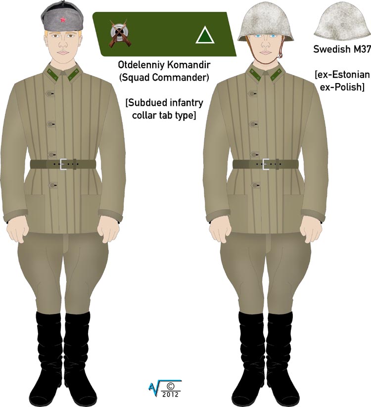 Lisatud, palun leidke minu värvitahvel, kahest Eestist taganenud Nõukogude Liidu sõdurist, kes siis Volkhov'i rindel talvelahingutest (1941-1942) osa võtsid. Sõdur paremal pool kannab siis nii sugust rootsi kiivrit, nagu Teie foto üleval näitab. Kas see vene talveriietus, mida ma siin joonistasin, on sobiv - või kas peaksin mingit teist talve mundrit selle värvitahvli jaoks kasutama?