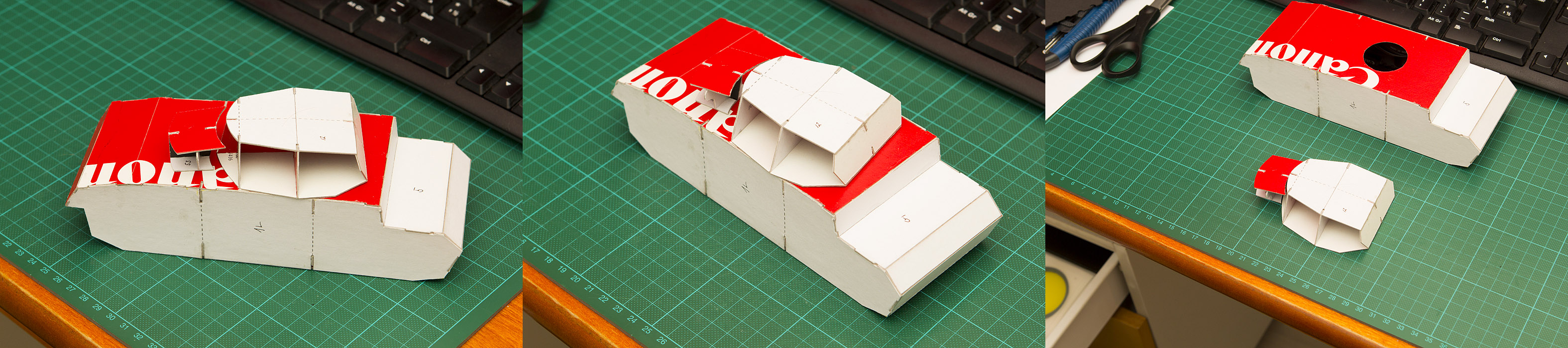Nonii, liimisin eile tugikarkassi detailid lõpuks omavahel kokku, nagu näha kasutasin vana kaamera pakendit, sobis väga hästi ca 300g/m² kartong. Töö juurest sai välja prinditud karkassi shabloonid õhukese tavalise paberi peale, värvilised lehed printisin 150g/m² paberile, mille kallal asun täna pusima :).