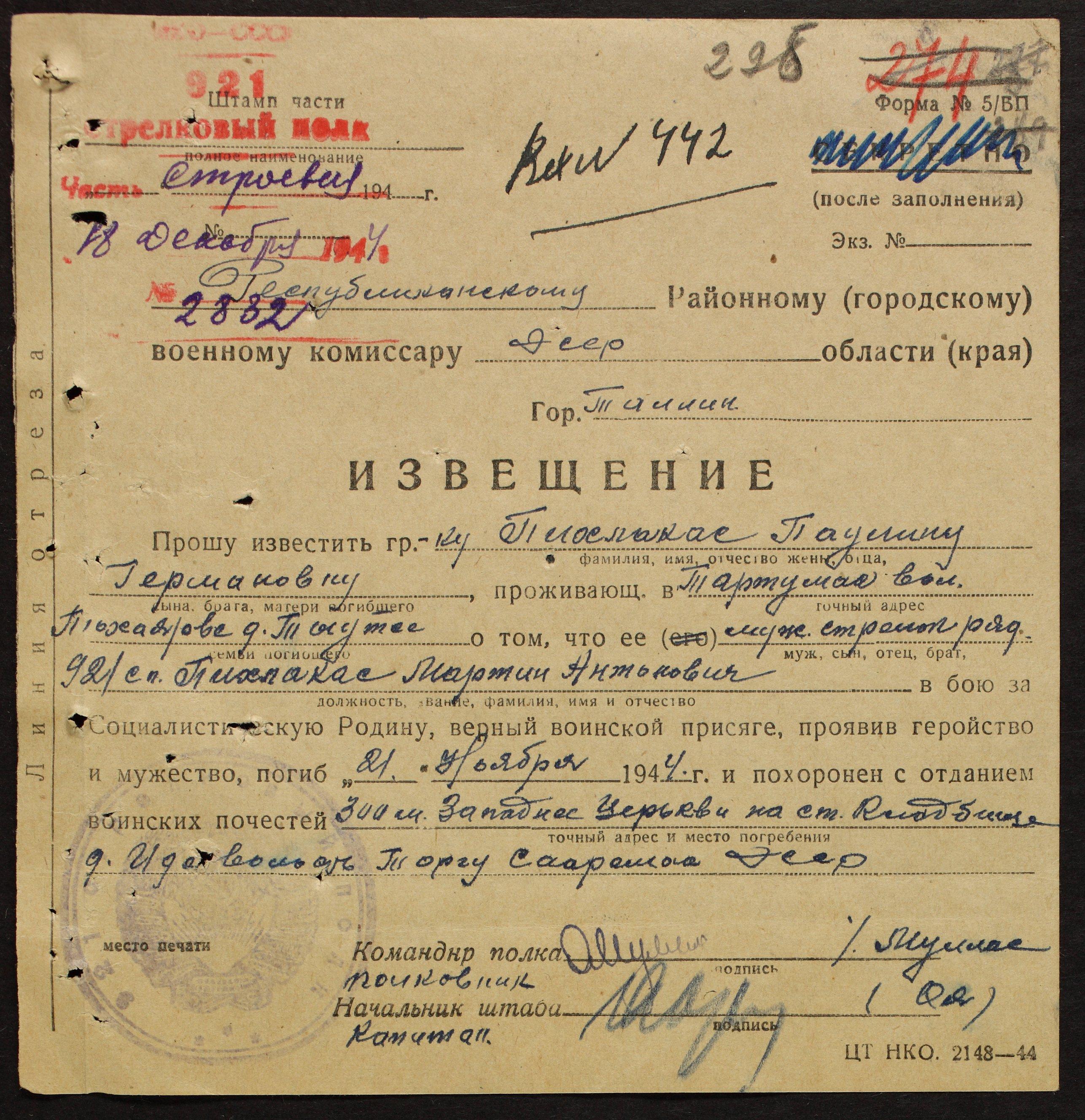 Panin selle koopia kaasa, kuigi tundub, et seal on midagi valesti, kui vaadata teate kuupäeva, siis surmateade on esitatud enne kui mees langes, või on see 22.11.1944 tema langemise aeg, siis klapiks.