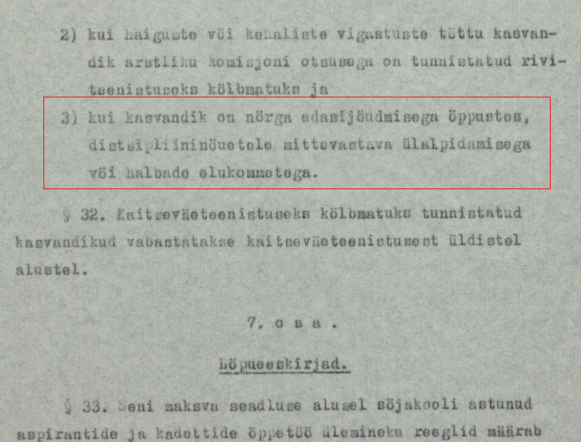 Tere. Kes oskab öelda mis oli kirjutatud Ohvitseride ettevalmistamise seaduses Paragrahvis 31 punkt 3 ? Inimene oli vabastatud selle punkti järgi. Tänud!