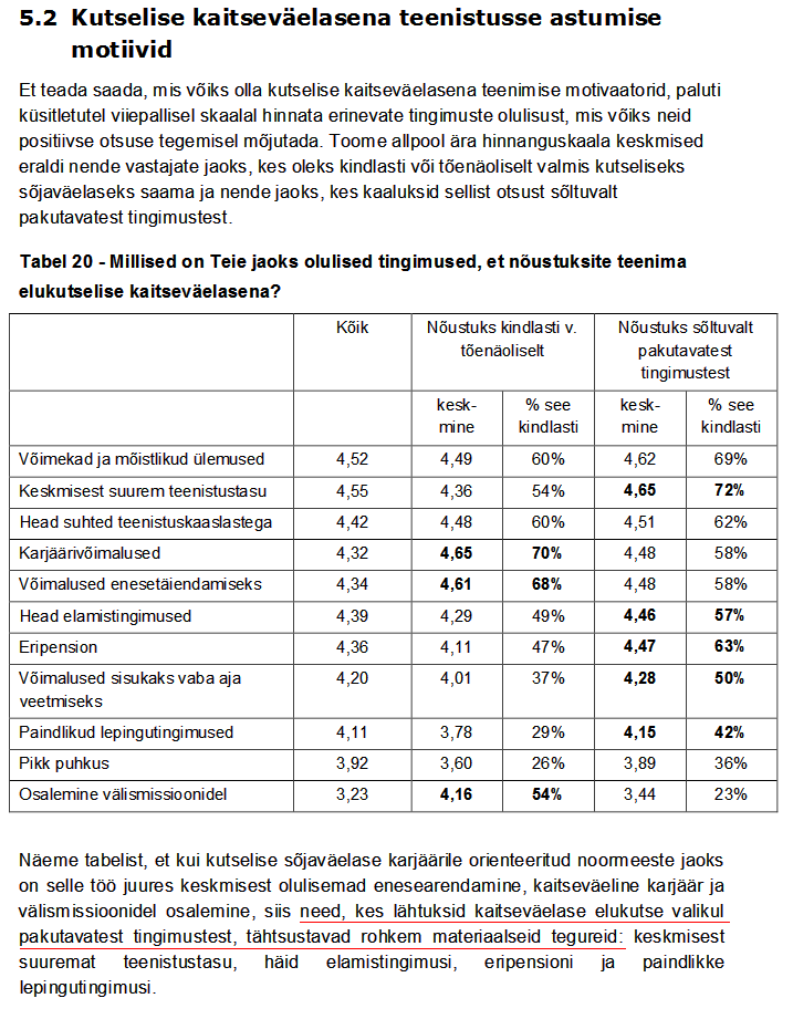kui teha küsitlus tingimuste kohta, siis saabki vastata ainult tingimuste kohta (IMHO ei puuduta ega näita küsitlus oluliste põhivalikute motiive, vaid järjestab pakutavad tingimused pingeritta). Aga pingeritta tuleks panna tingimuste loetelu asemel põhimotiivid (või need lisada). Elik tabelist puudub rida nt. mingis sellelaadses sõnastuses, nagu: "Saan panustada kodumaa/isamaa/pere kaitsesse"