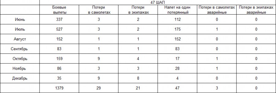 Выполнен 161 самолето-вылет. Уничтожено: 9 минометных батарей, 125 человек, разрушено 5 домов, вызвано 8 пожаров".