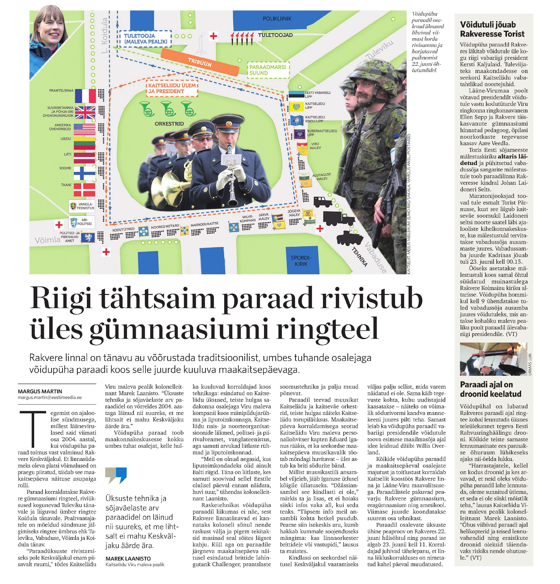 http://uusweb.kaitseliit.ee/et/rakveres ... upuha-linnParaadi rivis on 1000 inimest. Rakvere haigla polikliiniku ja Rakvere Gümnaasiumi kõrval asuval ringteel rivistuvad üles üksused Viru, Alutaguse, Jõgeva ja Järva malevatest ning Kaitseliidu valveüksusest. Lisaks on kompanii suuruste üksustega väljas Naiskodukaitse, Noored Kotkad ja Kodutütred ning liputoimkonnad Kaitseliidu koolist ja küberkaitseüksusest.