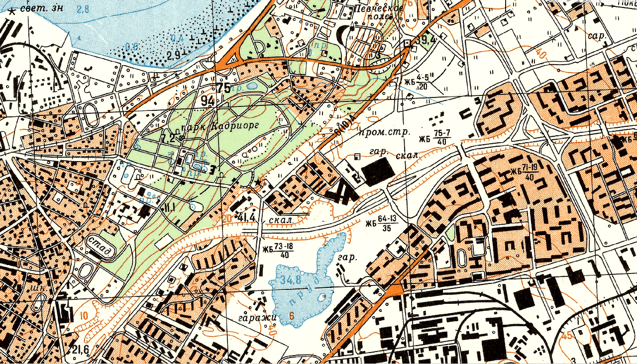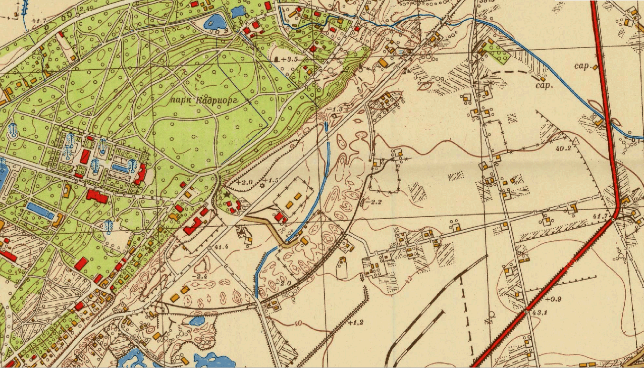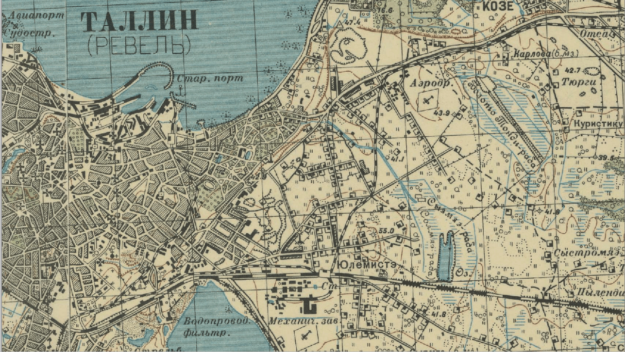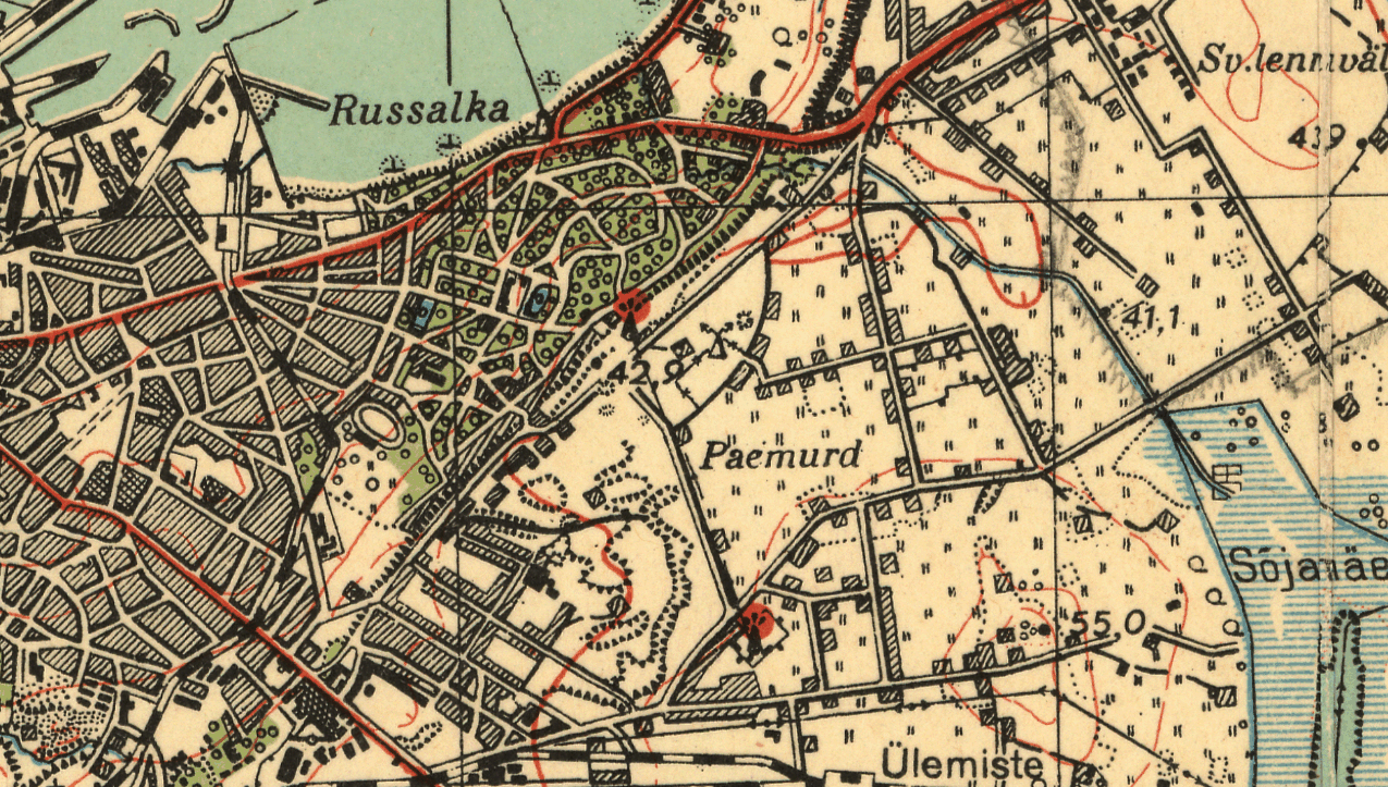 Väljavõte 1929 Eesti topograafilisest kaardist (1:25000), kust on näha et saatejaam asus Valge (ehk alumise) majaka läheduses, tänapäeval VTA ja KUMU naabruses