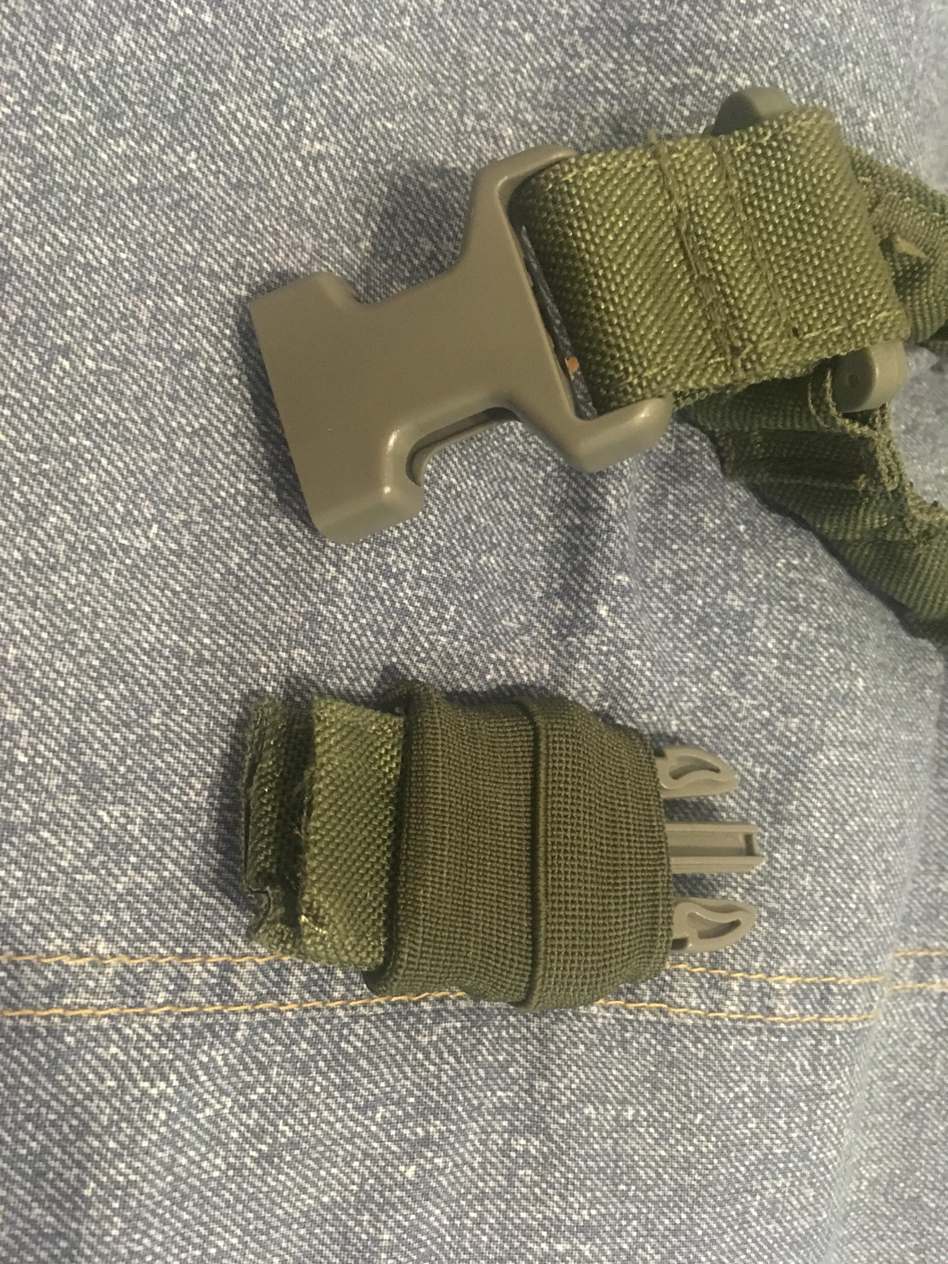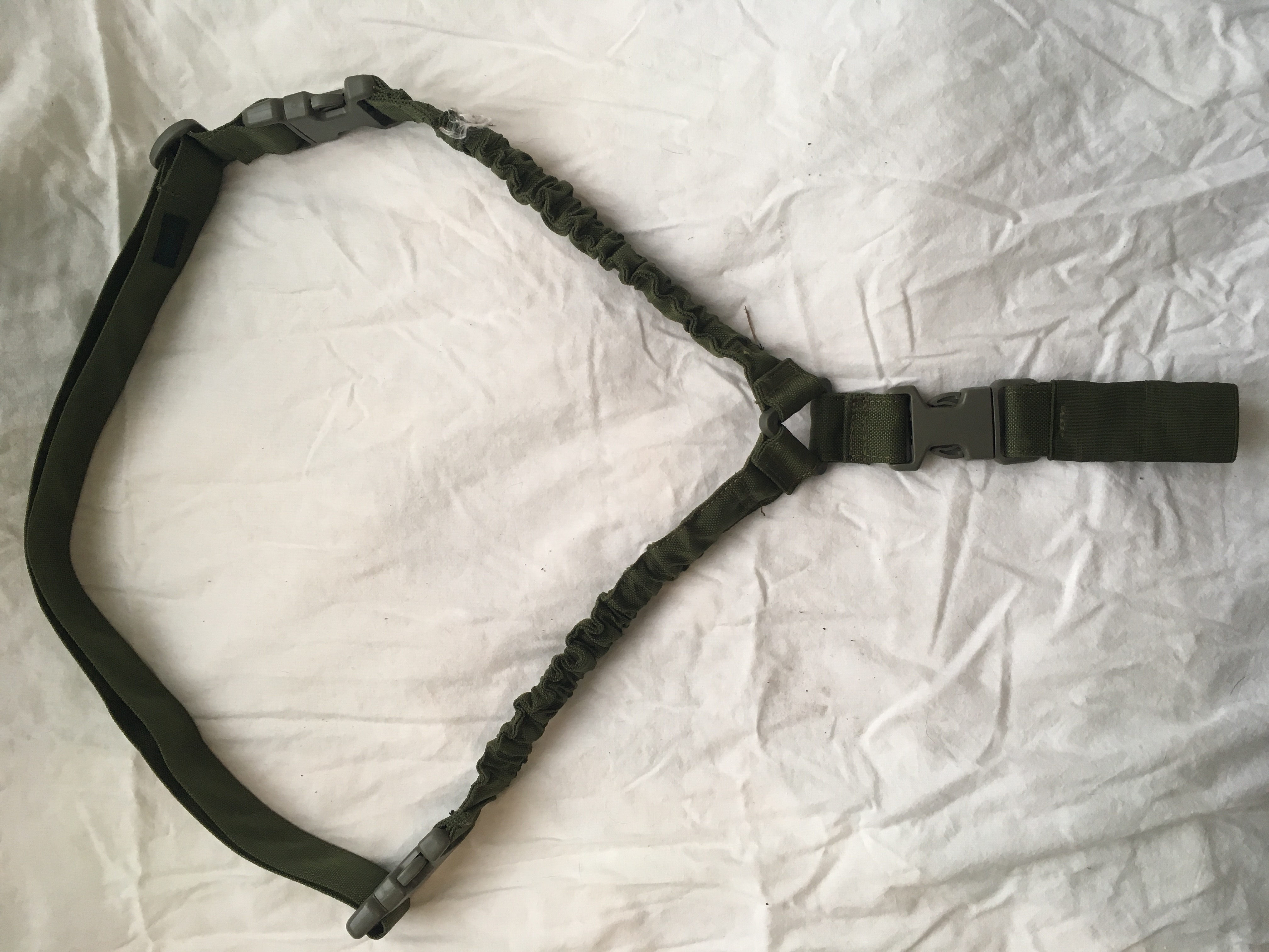 Müüa Nuproli ühepunkti relvarihm. Rihma relvapoolne osa (isane plastikpannal, karabiinirihm ja elastikosa) vajab uue karabiini kinnitamiseks õmblemist, karabiini ei ole.