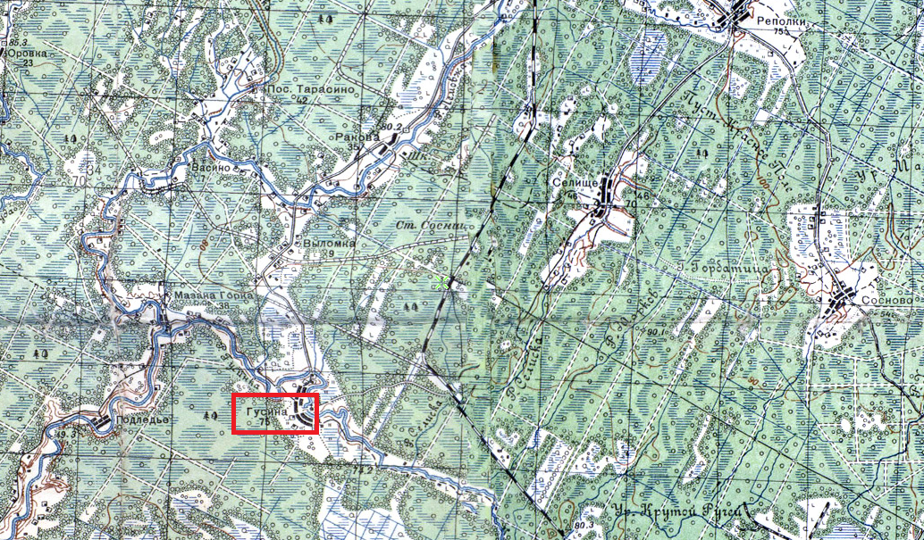 Leidsin tõenäolise koha nimega Гусино (Гусина) 30km Volossovost lõunas. Sealt läks alla Luuga suunas raudtee ja läbi Luuga sai Pihkvasse.