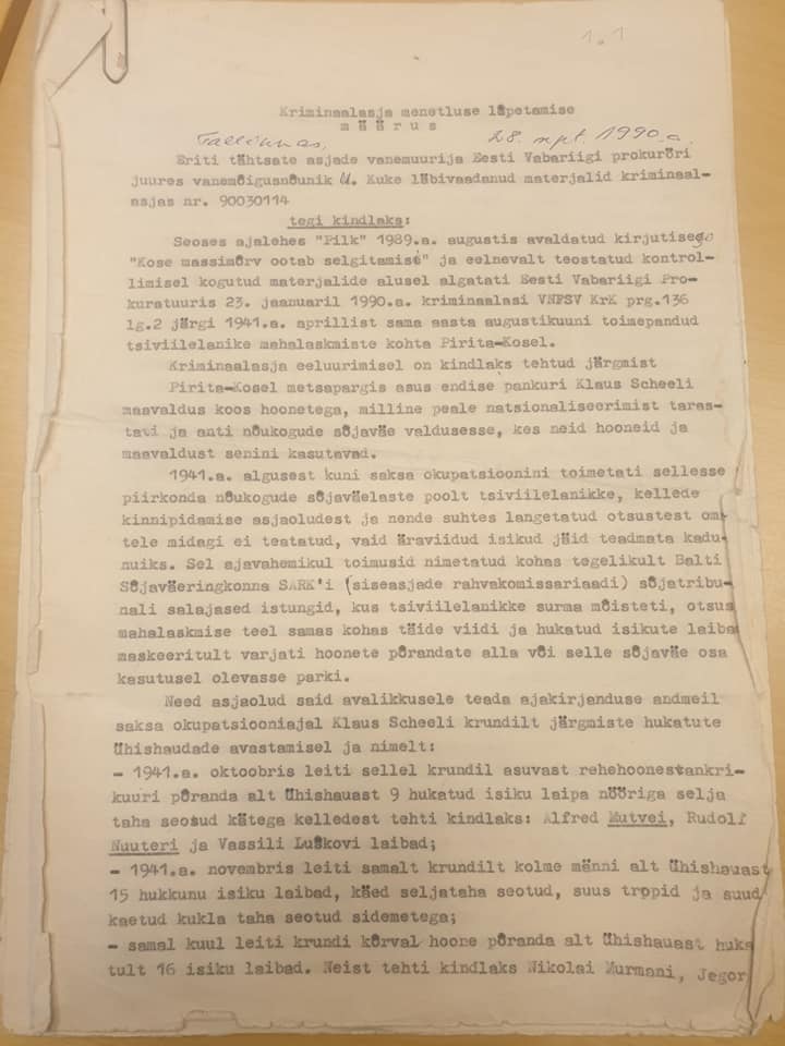 Pirita-Kosel 1941 aastal NKVD poolt hukatud inimeste kohta tehtud ekspertiisiakti esimene osa