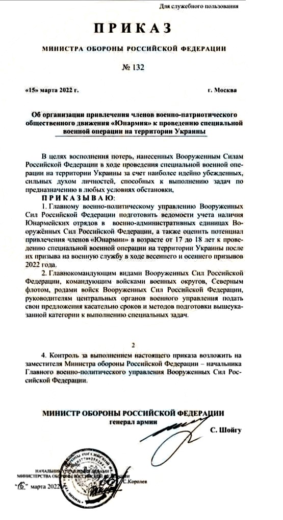 ▪️Соответствующий приказ «Об организации привлечения членов военно-патриотического общественного движения «Юнармия» к проведению специальной операции на территории Украины» подписан министром обороны РФ Шойгу.