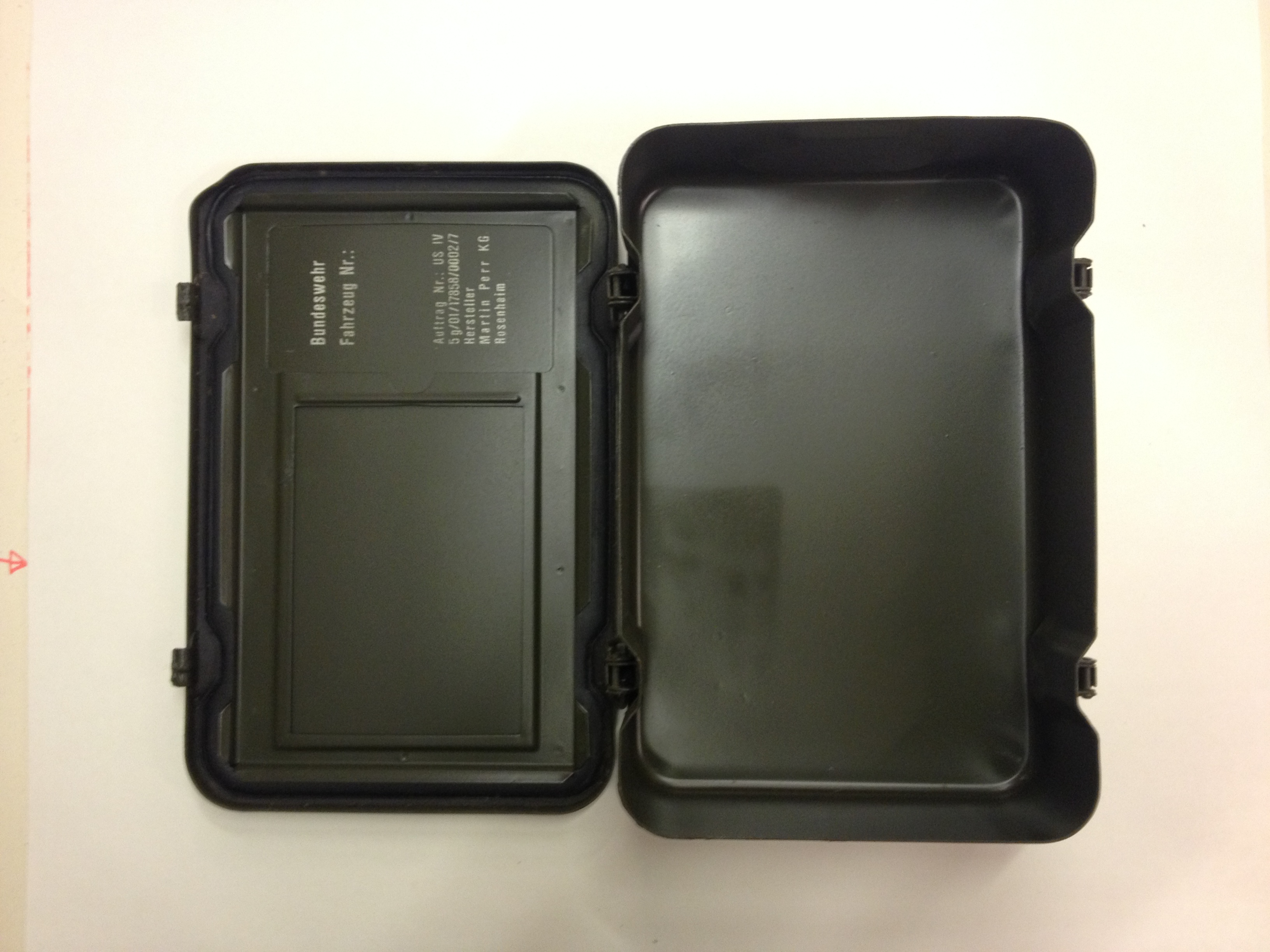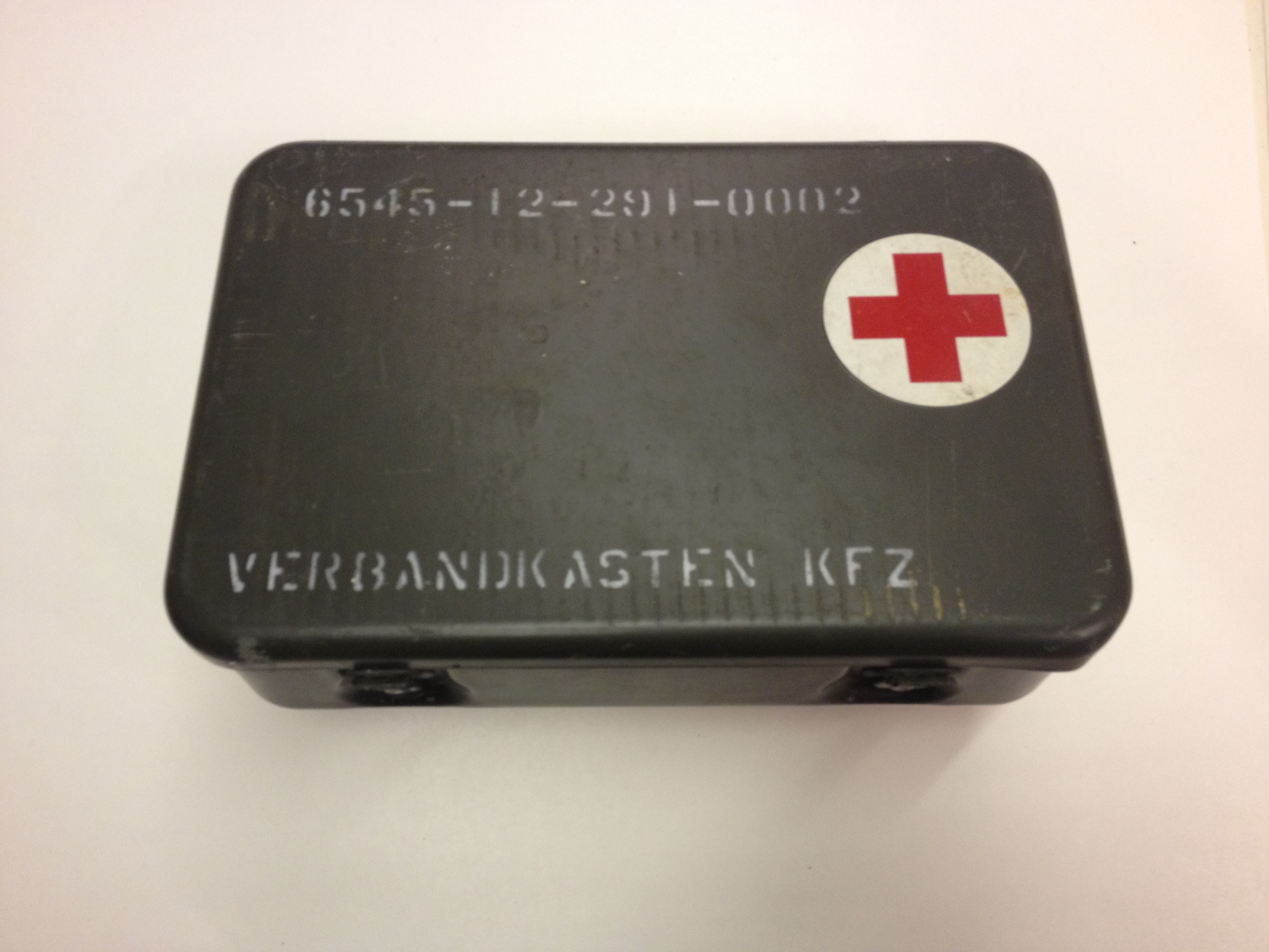 Originaalne Saksa sõjaväe esmaabikarp kollektsionääridele ja teistele militaarse esteetika huvilistele. Veekindlad tihendid, materjal metall.