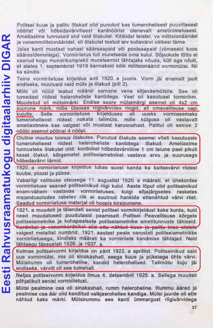 Pildil nr.3 on aga näha tormirihmaga politsei mütsi, mis vastab 1920 ja ilmselt siis ka 1922 kirjeldusele millel on ainult üks lipuvärvides mütsimärk, kusjuures lipuvärvid ei ole ringidena. Õlakud on riidest kuid ilma kantide ja triipudeta. Kraenurgad on ääristatud laiade heledamate kantidega (selle kohta ülaltsiteeritud materjalides üldse viide puudub). Varrukal ei ole näha mingeid kante ega triipe. Samasugune kuub on ka pilt nr.2 mehel. Kuue nööbid ei ole metallist ega lõvidega. Kusjuures mul kusagil olid kunagi ühes esivanemate vanas puukirstus ka need samasugused nööbid (ühed olid suuremad ja teised poole väiksemad - viimased on ilmselt taskute nööbid), nagu piltidel 2 ja 3 on näha. Need olid pruuni värvi, nagu/ilmselt nahast ja metallist/traadist kannaga.