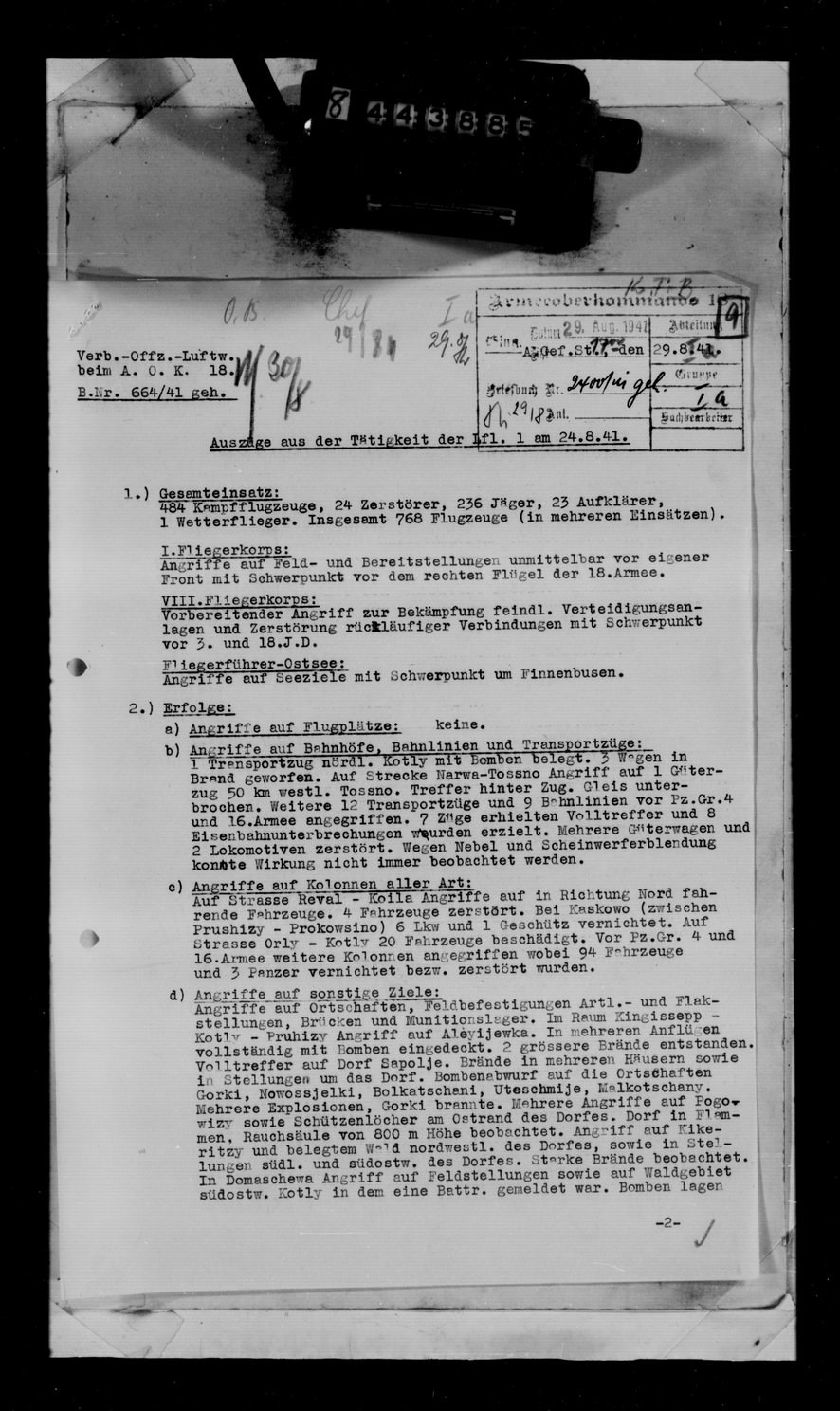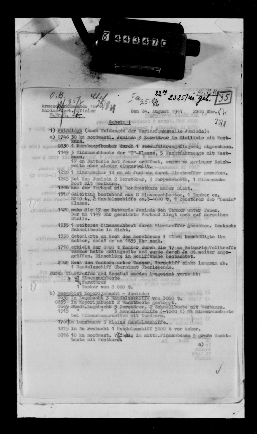 Eigene Luftaufklärung über Schwarzmeer, Finnenbusen, Eismeer, sowie Weißmeerkanal. Bei letzterem 23.8. Schleusen anscheinend repariert, geringer Schiffsverkehr. 24.8. neuer Ansatz von KG 77. Ergebnis steht noch aus. [...]