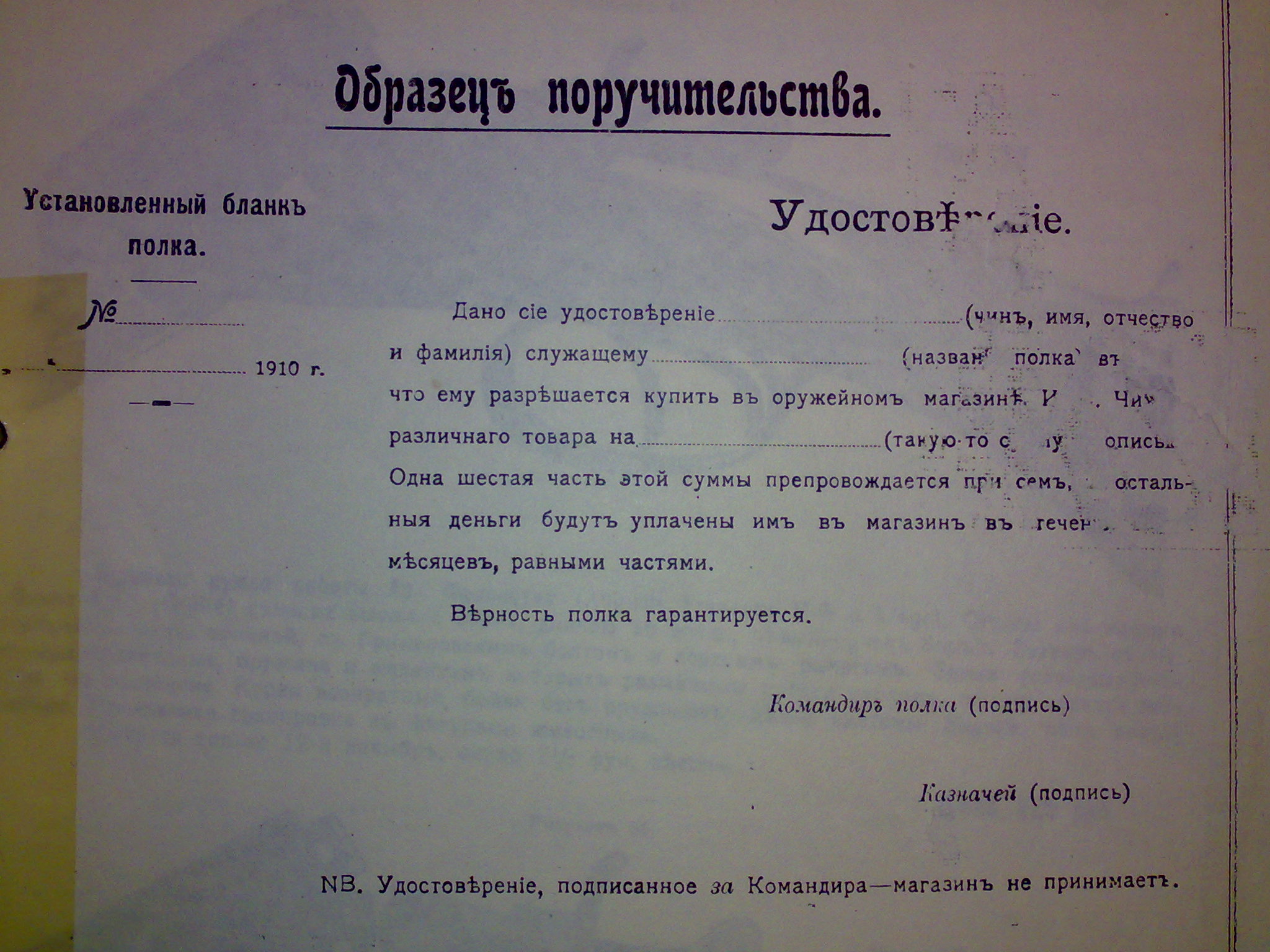 Sellise garantiikirja alusel sai relva ka järelmaksuga osta. Garantii anda sai vaid polgu komandör.