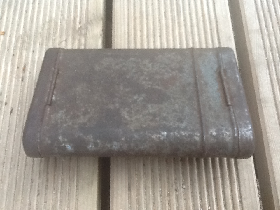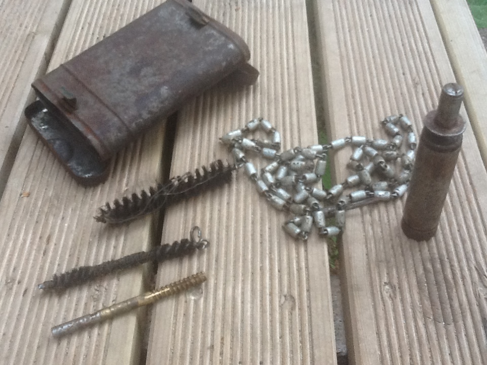 Müüa vana Saksa armee relvapuhastuskomplekt, seisukord piltidel. Ühe otsa peal numbrid 5 ja 98, teise peal mingi hoone kujutis ja kiri (pool kirjast kahjuks loetamatu). Paku ise hind.