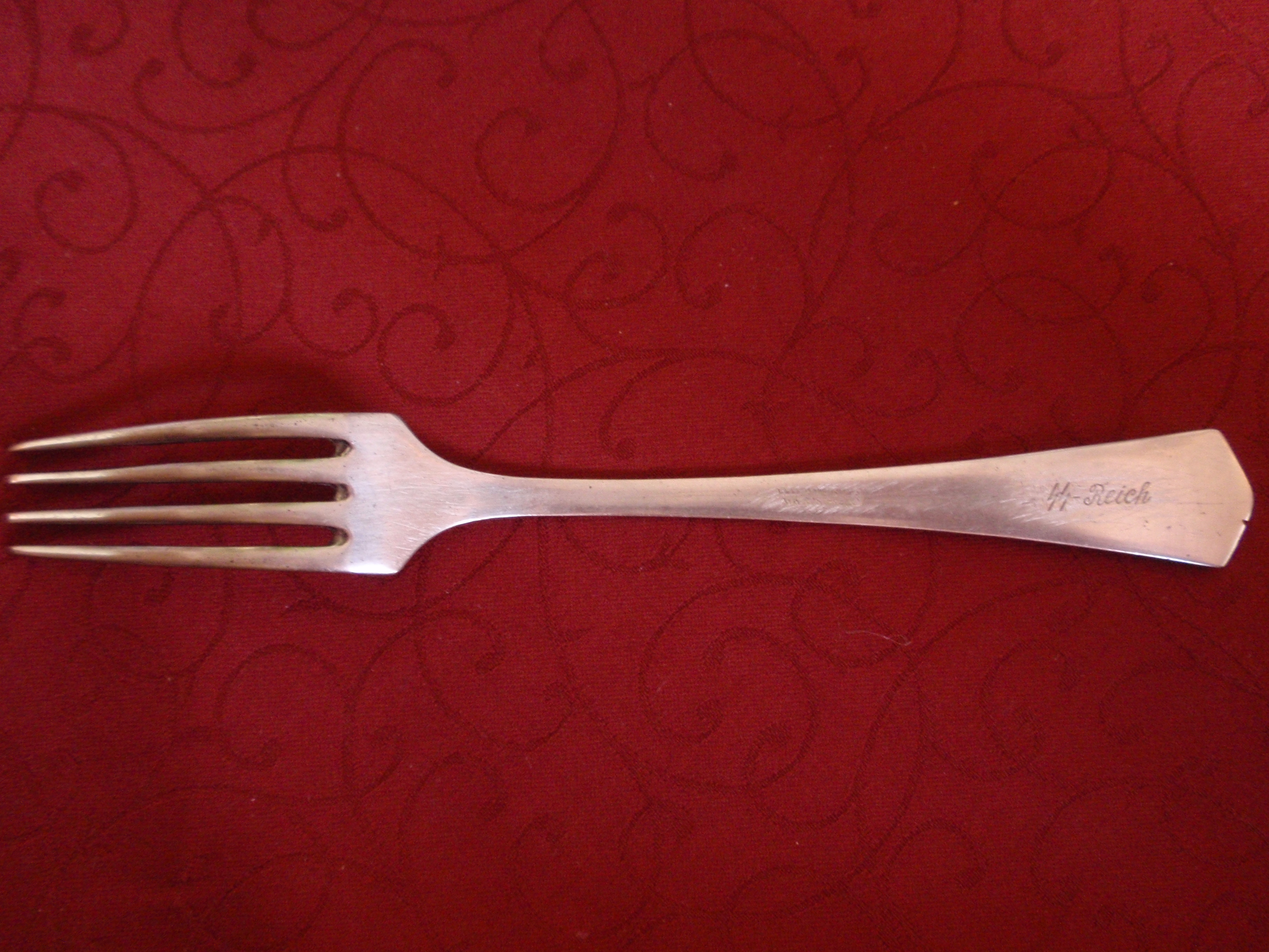 Ainukesed mulle teadaolevad SS-nõud, mida 100% Eestist leitud on, olid ca 10 aastat tagasi Kloogalt leitud klaaspudelid, milledele juba tehases peale valatud mingid kirjad (vist oligi Waffen-SS). Veel olen näinud kärakapudeleid, millede siltidel miskid SS-templid ja mis samuti 100% õiged asjad. Paari Eestist leitud SS-markeeringuga välipudeli korki olen ka trehvanud. Igasugu nuge-kahvleid, rääkimata siis taldrikutest-tassidest, mulle küll ei meenu, et oleks näinud, ikka ainult vuflood. Välguasju kukuti välismaal vorpima enam-vähem 10. mail 1945, terve maailm upub nendesse produktidesse, iseküsimus on, kuidas ja kas võisid sellised esemed sattuda meie maale ütleme 60-70-dail aastatel. Antud kahvli puhul oleks praegusele infole tuginedes tegu puhtalt ilusa loo ostmisega, ese ise tahaks näitamist WAF-is laiadele ringkondadele.