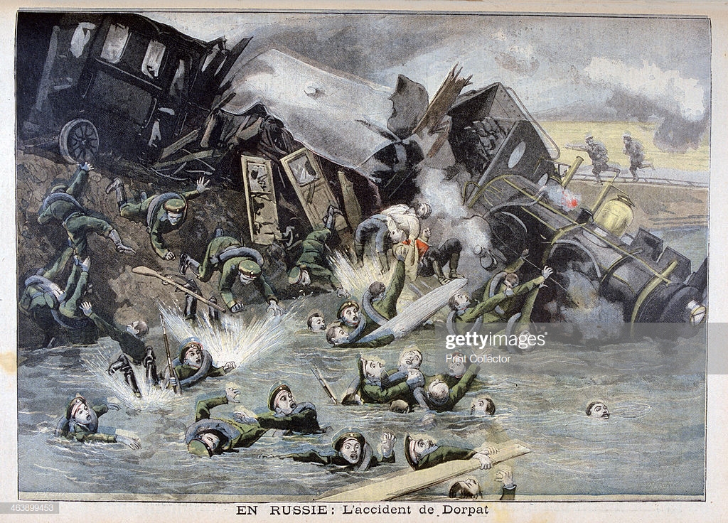 Military train accident in Dorpat, Russia, 1897. Artist F Meaulle