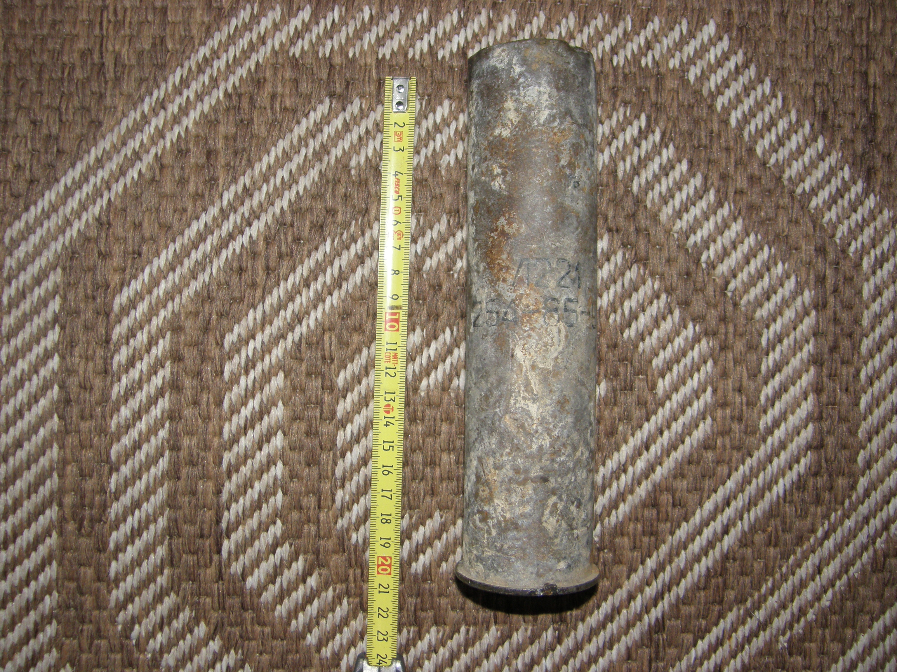 Siis selline hülss jäi näppu. Olla Raadi lennuväljalt üles korjatud. Näeb välja natuke nagu oleks 45 mm TT kahuri hülss lühemaks lõigatud, aga pole ka päris see. Igat pidi otsinud, aga kuskilt midagi sarnast leidnud ei ole, russianammo lehekülg jääb ka vastuse võlgu minu arust. Lennuväli võiks viidata mingi lennumassina pardarelvale, aga juba ammust ajast ju eelistatakse rimless moona igasugustel sellistel kaliibritel, et mis see siis on, nii uue aja asi ja rimmed hülsiga. Aastaarv võiks nagu 90 olla küljel oleva kirja põhjal. Talla all mingeid erilisi markeeringuid ei olnud, proovisin tabada seda vähest, mis sinna löödud oli, asi oksüdeerunud ka servadest, aga muud ei paistnud olevatki. Põhiline info paistab ikka hülsi küljel olema.