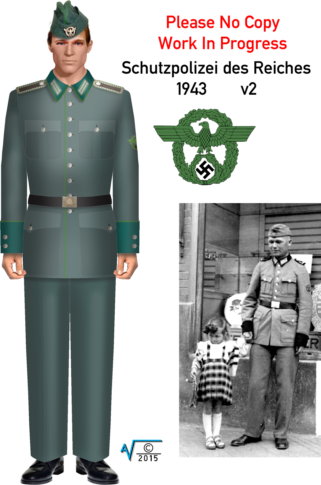 Valmistasin selle värvitahvli saksa Schutzpolizei vormist, kuna see on mis selles lisatud fotos näha on. Kuna munder fotos on saksa Schutzpolizei oma - olen üsna kindel, et see foto tehti enne kui ta siis Eesti diviisi astus - muidu oleks tal tavaline Waffen-SS munder seljas. Pisi tüdruk fotos hoiba oma isa kätt.