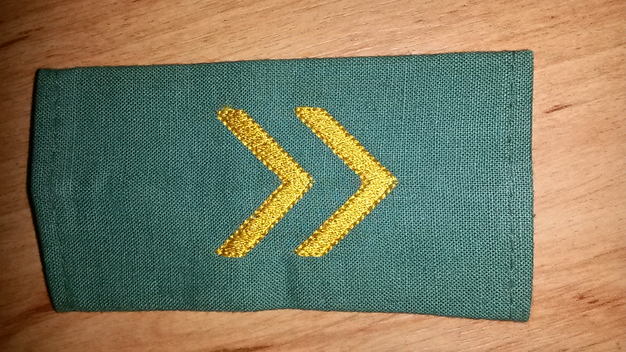 1943-54 kautuses olnud pagun, arvata on et rahuaegne. Kandi ja põhja värvi järele otsustades autotankiväed, kuna üldväeline embleem peal, siis ilmselt autojuht, jalaväelane, staabi asjapulk või miskit sellist. Seersandi auastmes.