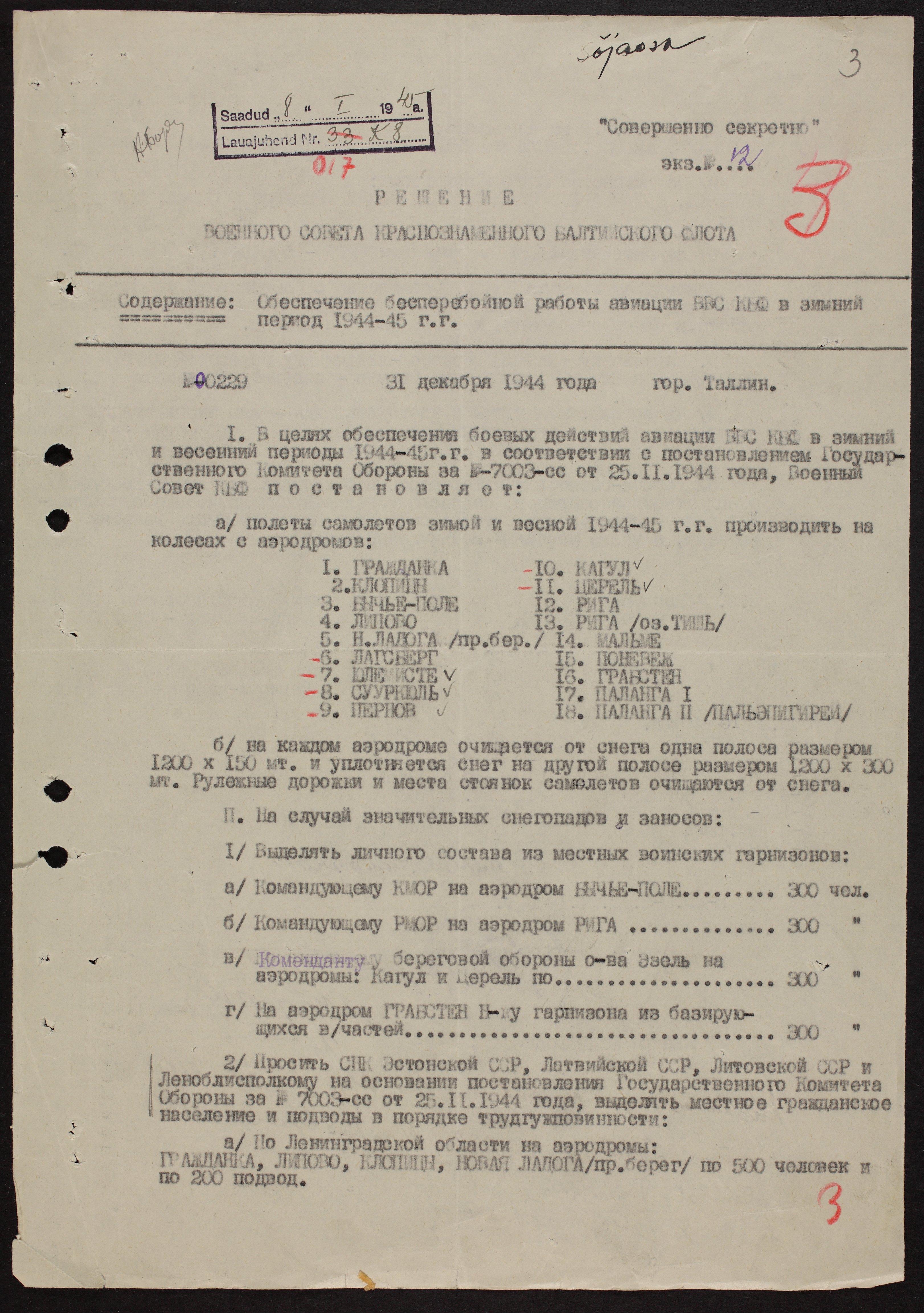 Teine dokument Baltimere laevastiku lennuväe kohta. 1944/45 talvel kasutusel olnud maalennuväljadest, kuhu telliti kohaliku võimu käest lumerookijaid.